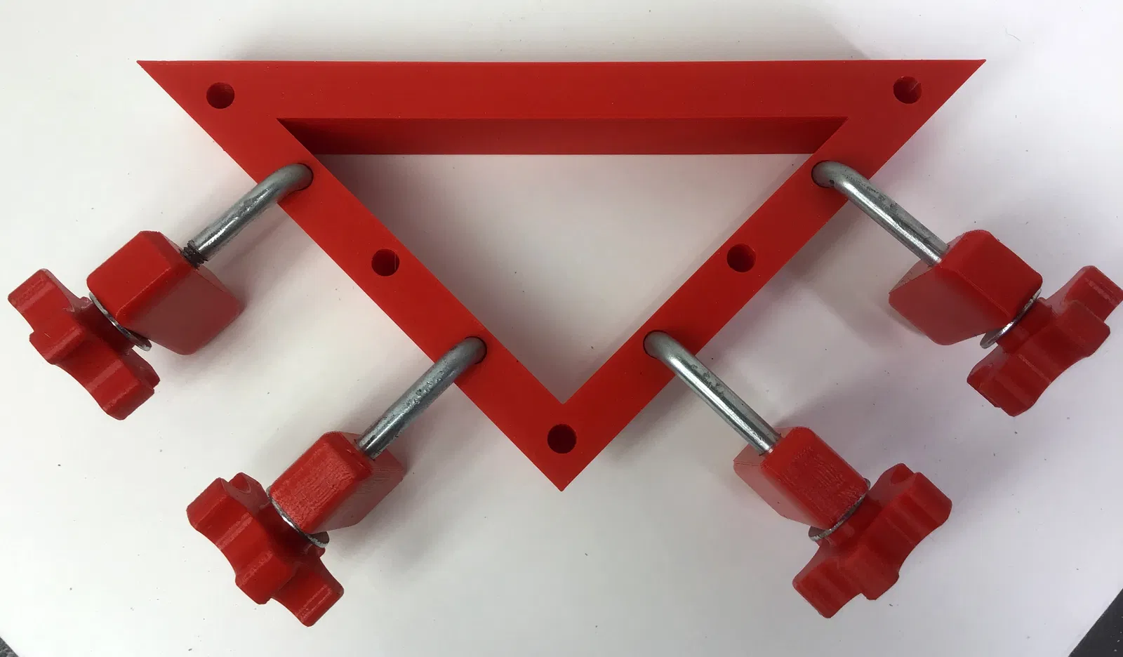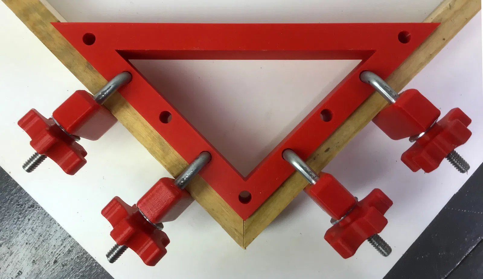 Mẫu kẹp góc tam giác này dùng ốc L, có gờ định vị. Dùng ốc máy ¼"-20 chế tạo, có thể cần tùy chỉnh độ dài. Tham khảo thêm các mẫu kẹp đa năng khác như ê tô nhỏ, kẹp nam châm, kẹp góc vuông 90°.