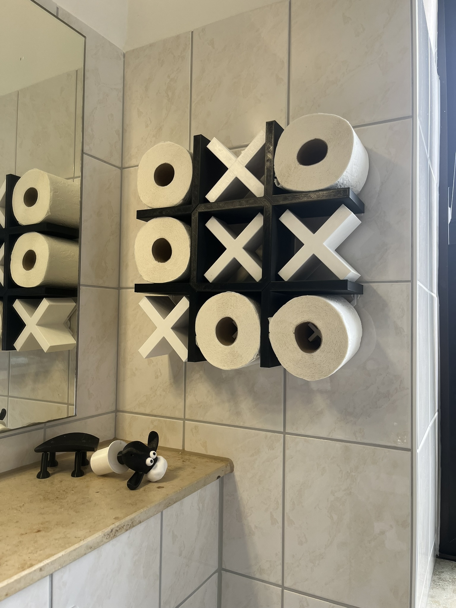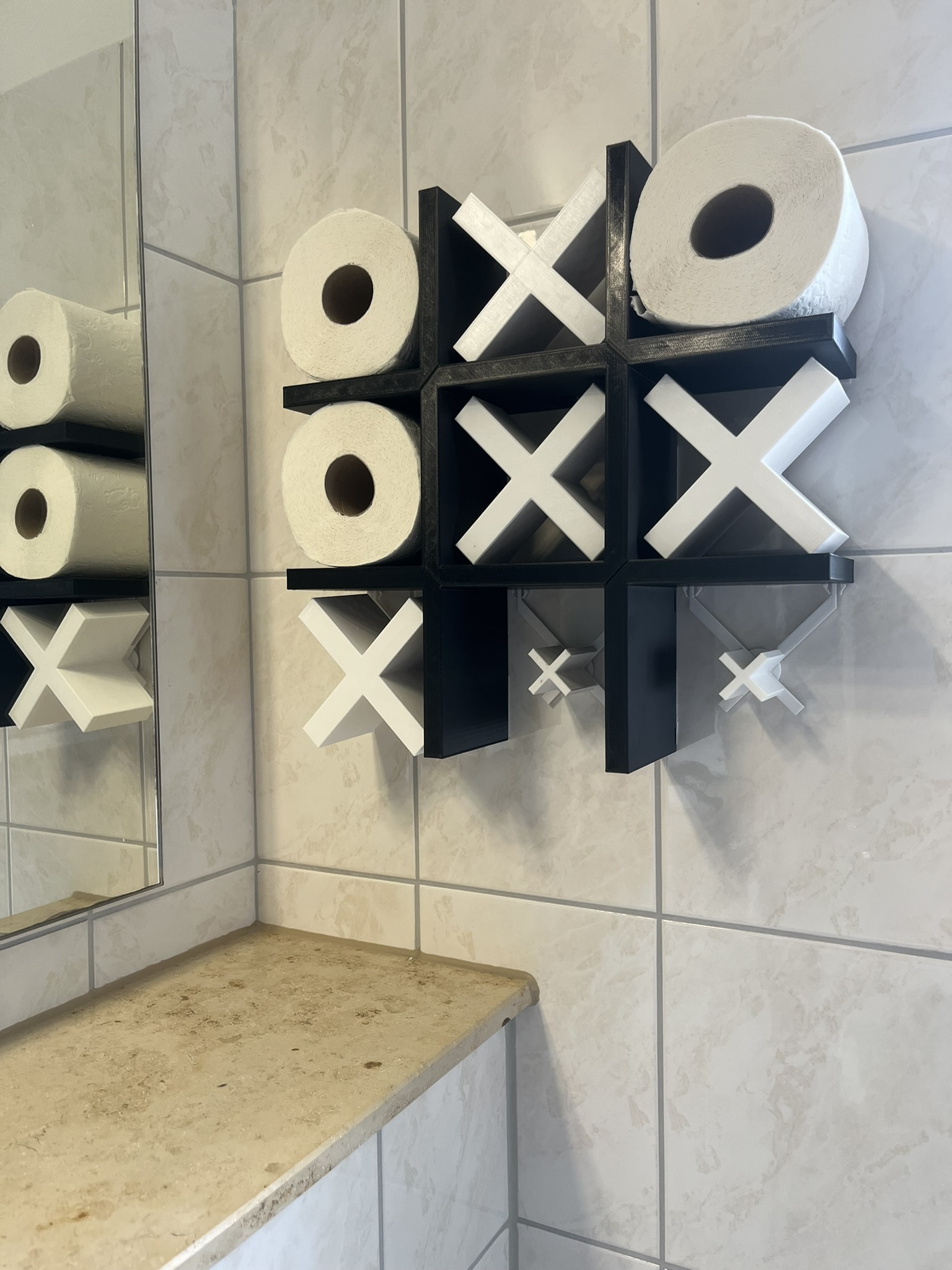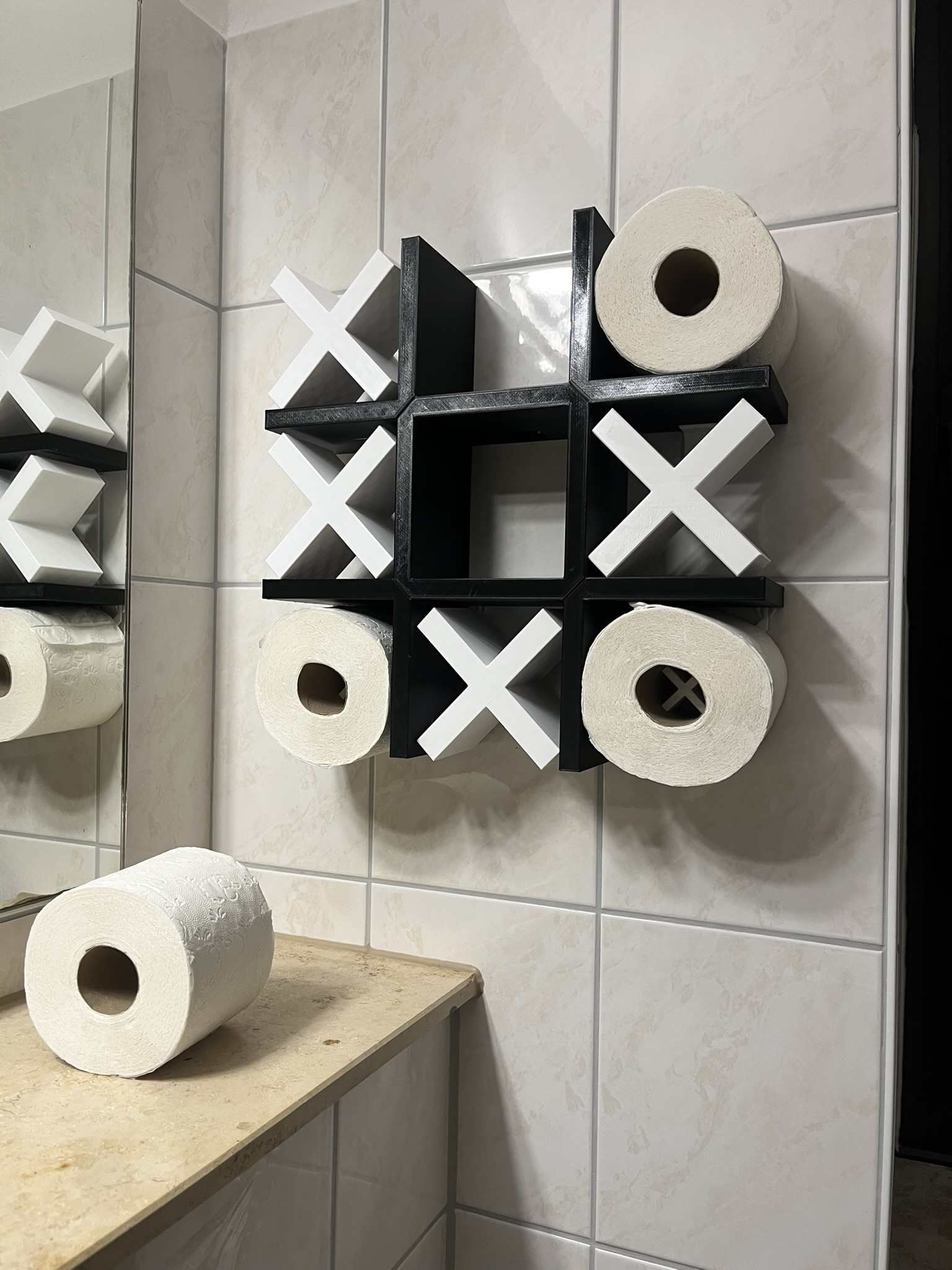 Cái giá treo giấy vệ sinh gắn tường này được thiết kế giống như một bàn cờ caro (tic-tac-toe).