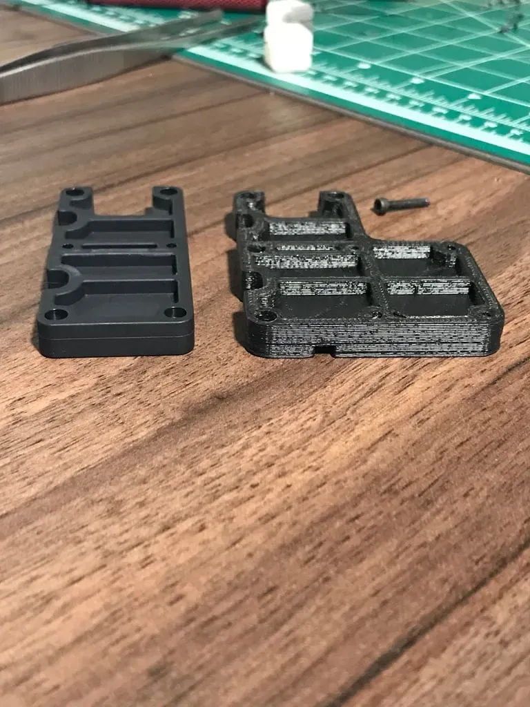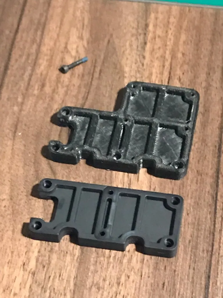 Tôi đã in bằng ABS, 0.3mm, 50% độ đặc với hỗ trợ. Nó rất mạnh trong cấu hình này. Hai lỗ bên ngoài mỏng hơn, vì vậy bạn có thể gắn các bu lông mà không cần khoan lỗ trên tấm khung carbon.