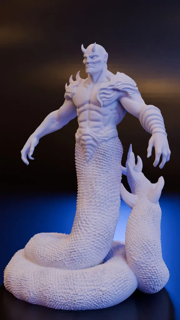 Trong quá trình thực hiện mô hình này, mình bắt đầu với một lưới cơ bản từ AI. Chúng thường không làm tốt phần thân rắn nên mình đã loại bỏ phần đó và tạo một thân rắn với đường cong, sau đó điều chỉnh và bán kính cho đến khi vừa ý. Mình đã tạo hình phần thân nhưng không thay đổi so với A-Pose vì nhìn vào hình ảnh tham khảo thì nó khá giống với hình ảnh đó. Mình đã thêm một vài chiếc sừng và gai vào đuôi rồi ghép tất cả lại. Vì nó ở tư thế A-Pose nên sẽ dễ dàng điều chỉnh nếu bạn muốn di chuyển tay. Hình ảnh tham khảo cho thấy hắn ta có bàn tay năm ngón nhưng bốn ngón cũng được. Mình không làm móng tay cho hắn nhưng với bản in resin khổ lớn thì nó sẽ hiện rõ, nên NẾU bạn là người muốn có Mammon với những ngón tay xinh đẹp thì cứ cho mình biết, mình sẽ làm một bản phối lại cho bạn.