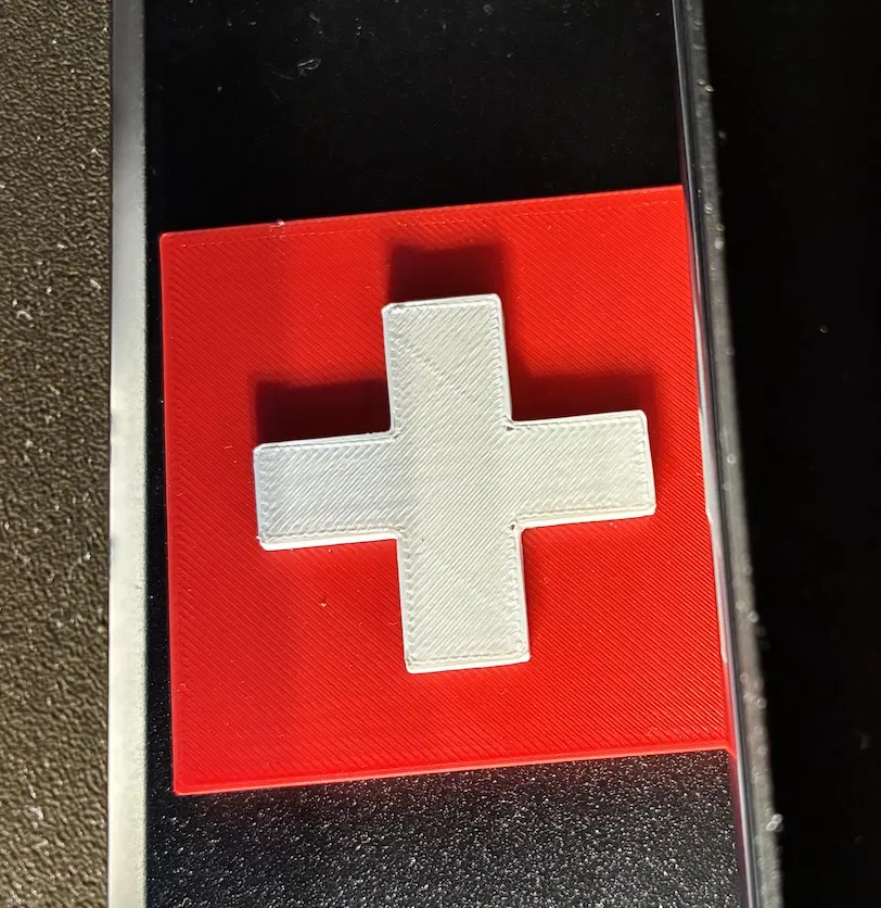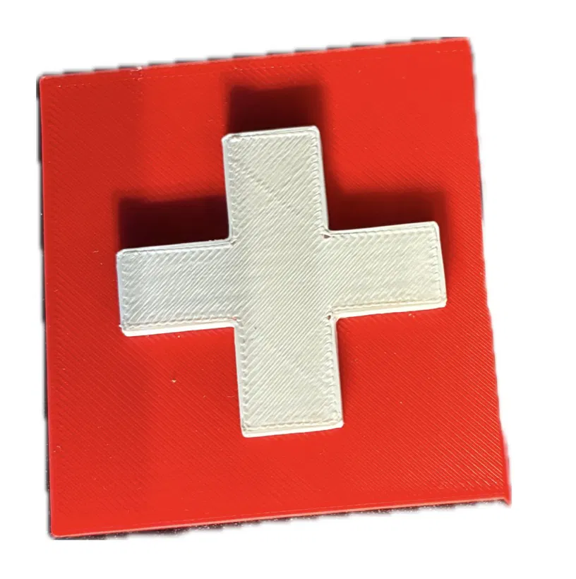 Cờ Thụy Sĩ 3D, in 2 màu bằng cách đổi filament khi in. Bắt đầu bằng màu đỏ, sau đó đổi sang màu trắng để có chữ thập. Lưu ý cách gắn để tránh va chạm máy in.