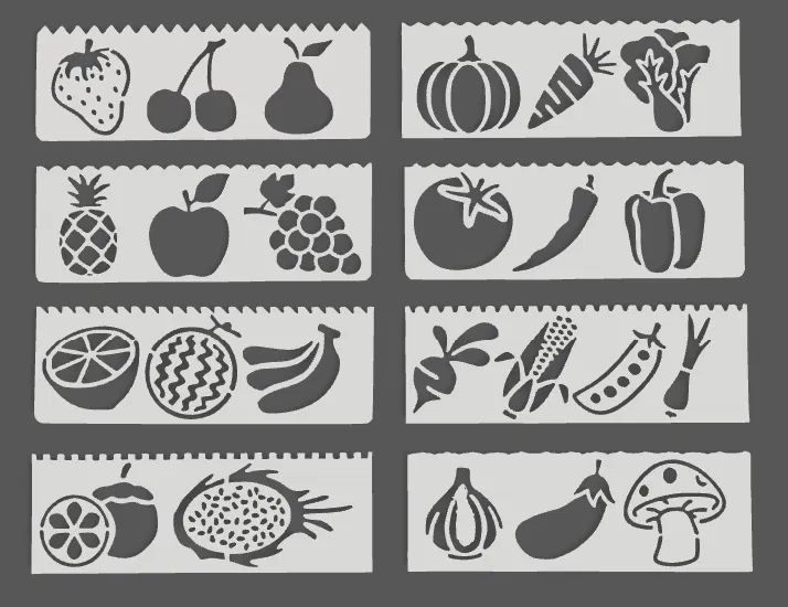 Bộ khuôn vẽ trái cây với 8 mẫu khác nhau, được thiết kế đặc biệt cho trẻ em. Bé có thể tha hồ sáng tạo và in những mẫu yêu thích để vẽ.