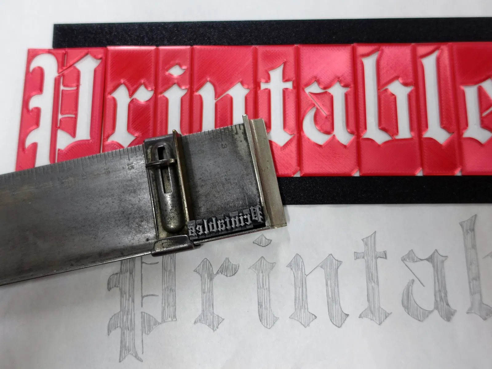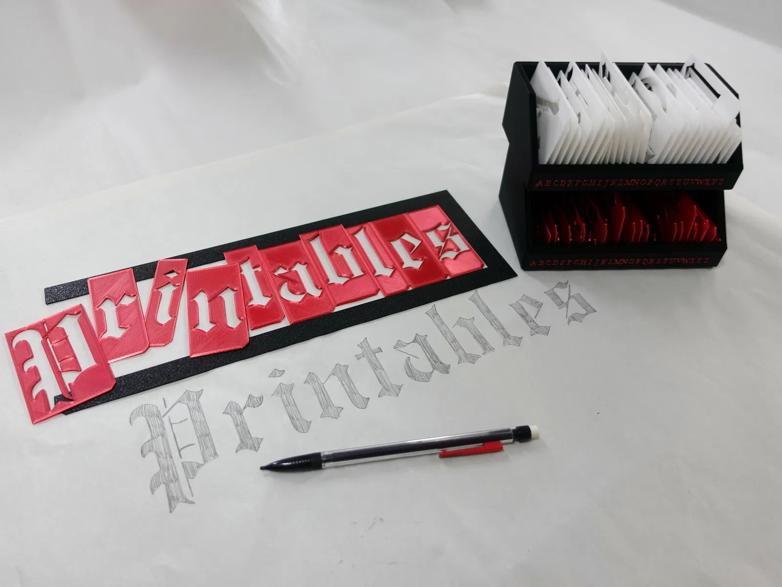 Lấy cảm hứng từ bộ chữ rời truyền thống và niềm yêu thích của tôi với ngành in letterpress, tôi đã tạo ra một bộ khuôn vẽ chữ rời. Khác với các bộ khuôn alphabet khác, hệ thống này giúp bạn khỏi phải suy nghĩ về khoảng cách giữa các chữ cái và giữ cho mọi thứ thẳng hàng. Tôi chọn font "Engravers Old English" vì đó là bộ chữ letterpress mà cá nhân tôi sở hữu và rất yêu thích. Thành thật mà nói, đây là một trong những font chữ tệ nhất để biến thành khuôn vẽ vì nó có nhiều đường mảnh và nhiều vùng không gian âm. Tuy nhiên, tôi đã cố gắng hết sức để điều chỉnh nó thành một hình dạng có thể sử dụng làm khuôn vẽ.