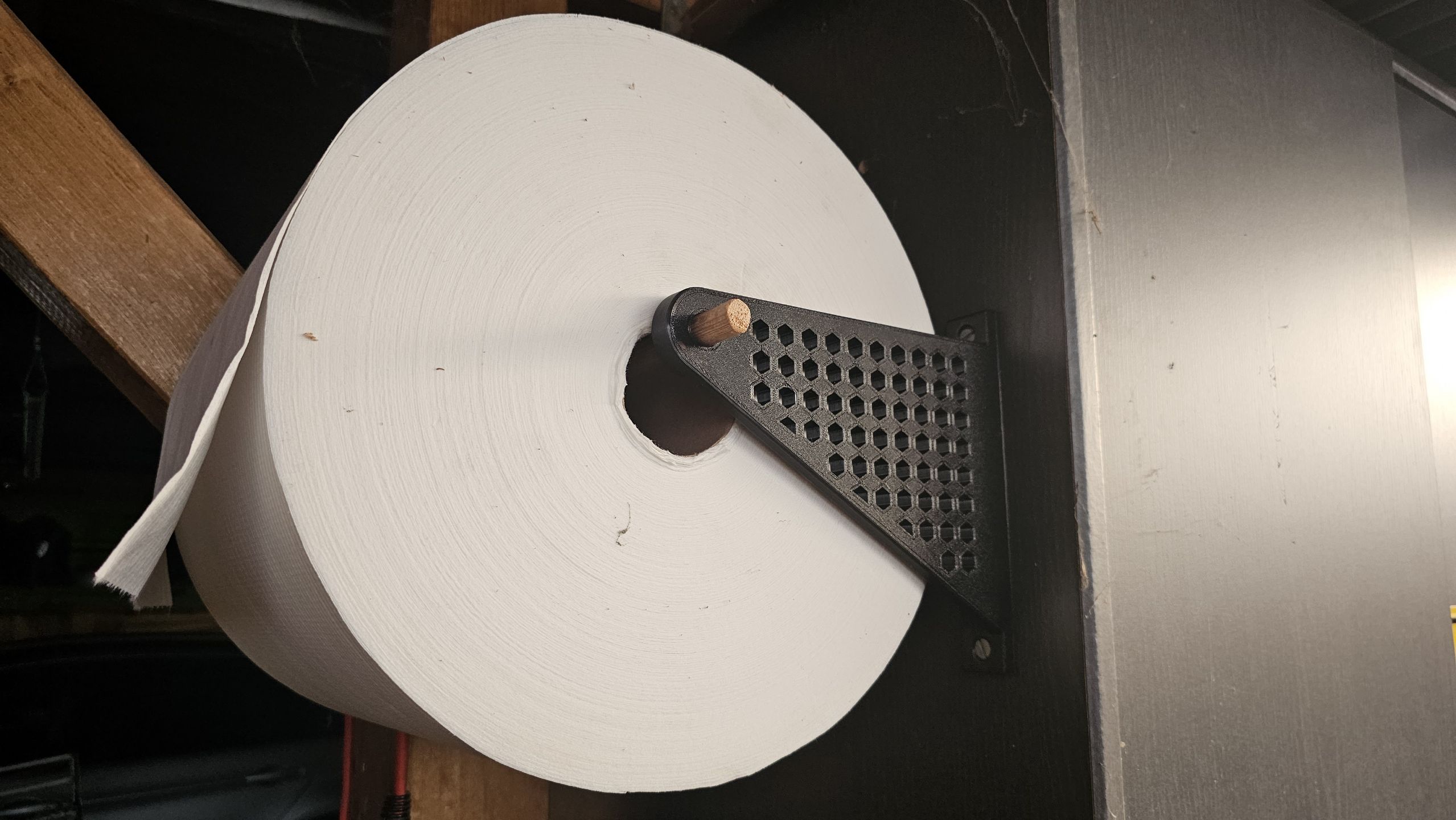 Chân đế độc đáo này được thiết kế để giữ cuộn giấy lau cỡ lớn, lý tưởng cho các tiệm sửa xe hoặc không gian làm việc chuyên nghiệp. Trục bằng gỗ 15mm cho phép cuộn giấy xoay trơn tru, với lỗ trục 16mm được thiết kế cẩn thận. Phiên bản in xoay ngược và cập nhật với họa tiết lục giác.