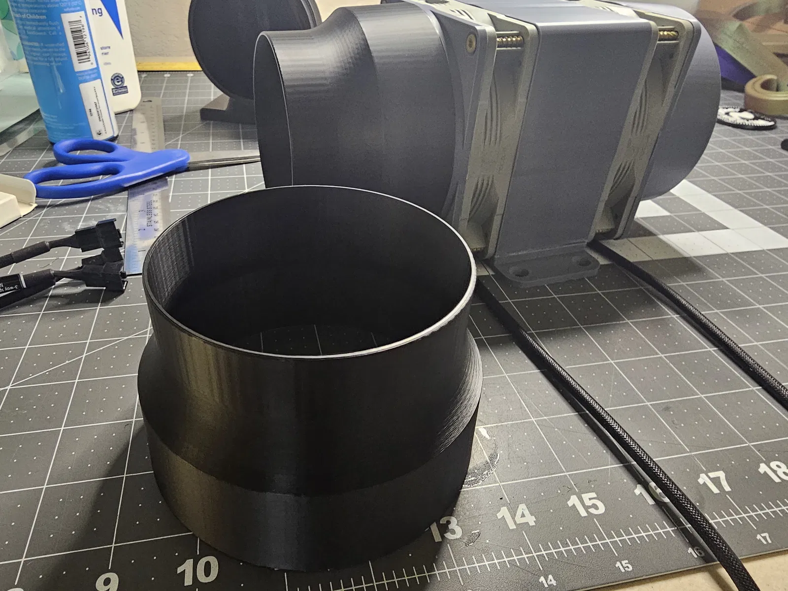 Tôi chắc là tôi có thể thiết kế lại cả cái đầu nối luôn á, nhưng làm cái adapter này thì dễ hơn. Cái này chuyển đổi ống khoảng 5 inch sang ống 4 inch, loại này có vẻ phổ biến hơn.