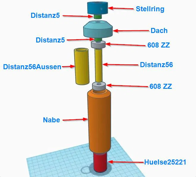 Cảm ơn astfaellergerald vì đã tạo ra Vertical Windturbine Ver. 2. Tôi rất thích phiên bản 2 (NEW P1-5) của astfaellergerald, nhưng việc làm sạch và dán tất cả các bộ phận cũng tốn kha khá công sức. Tôi đã suy nghĩ về việc ghép hai nửa trên và dưới lại rồi in thành một mảnh. Tôi đã in các bộ phận của tua-bin gió bằng PLA và dán chúng lại với nhau bằng keo hai thành phần. Tôi muốn lắp tua-bin gió trên một thanh (ống), vì vậy tôi đã thay đổi vòng bi. Tôi đã in trục quay từ PETG với 4 lớp thành, chiều rộng đường in 0.44mm, mật độ ruột 40%. Trục quay vừa với thanh 25mm, hoặc với ống lót thì vừa với thanh 22mm. Nếu bạn muốn lắp trục quay vào đường kính thanh khác, bạn có thể điều chỉnh ống lót bằng cách mở rộng lỗ theo chiều ngang (trong Cura). Với vòng đệm và ốc vít, đai ốc M3, bạn có thể cố định trục nếu cần. Đối với trục quay, tôi khuyên bạn nên in thử và nhấn chìm 105mm theo trục Z. Sau đó, đo đường kính bên trong (22mm) và bù đắp cho sai lệch có thể xảy ra bằng cách mở rộng lỗ theo chiều ngang (trong Cura). Cần có một trục 8x350 mm và vòng bi 608ZZ 8x22x7 mm. Lắp ráp: Ở hình thứ tư, bạn có thể thấy vòng bi được lắp ráp như thế nào. Một vòng bi màu xám được lắp vào Nabe (màu cam) từ phía trên, sau đó hai cái Distanz56 (màu vàng) và vòng bi thứ hai (màu xám) được lắp vào. Trên bánh công tác gió, khoan rộng lỗ ở giữa bộ phận P3, 4 và 5 lên 8 mm. Dán các bộ phận của cối xay gió lại với nhau, sau đó lắp trục 8x350 vào cối xay gió cho đến đỉnh. Khoan rộng các bộ phận sau bằng mũi khoan 8 mm, sau đó lắp Stellring (màu xanh đậm), Distanz5 (màu xanh lá) , Dach (màu xanh nhạt) và Distanz5 (màu xanh lá) từ phía dưới. Bây giờ hãy đặt bánh công tác gió cùng với trục vào vòng bi. Tôi đã in tất cả các tua-bin gió bằng PLA. Tôi khuyên dùng PLA màu sáng với nhiệt độ không khí dưới 35°C. Nếu trời nóng hơn hoặc nếu bạn sử dụng sợi filament tối màu, thì hãy dùng PETG hoặc tốt hơn là ASA. Tôi cũng muốn giới thiệu các tua-bin gió sau: Illusion Windturbine MK2 counter-rotating Double rotor addon for wind turbine MK2 Double wind turbine MK3 counter rotating https://www.f3d.vn/3d-model/155948-tua-bin-gio-doi-mk3-voi-canh-quat-doi-khang Wind Turbine MK3 neo Remix Archimedes Wind Turbine Remix https://www.f3d.vn/3d-model/163735-coi-xay-gio-archimedes-remix Ugrinsky Vertical Axis Wind Turbine Remix https://www.f3d.vn/3d-model/163736-bien-the-coi-xay-gio-truc-doc-ugrinsky Mini Airplane Wind Turbine https://www.f3d.vn/3d-model/163739-mo-hinh-coi-xay-gio-mini-hinh-may-bay Savonius Vertical Wind Turbine Remix https://www.f3d.vn/3d-model/163738-bien-the-turbine-gio-truc-dung-savonius Windturbine MK2 neo Remix https://www.f3d.vn/3d-model/163741-coi-xay-gio-mk2-neo-remix Illusion Windturbine 200 / 250 Toroidal Illusion Windturbine Illusion Windturbine TIE F. Tail Fin Wind Turbine 620 mm Wind turbine savoniov helix – Remix