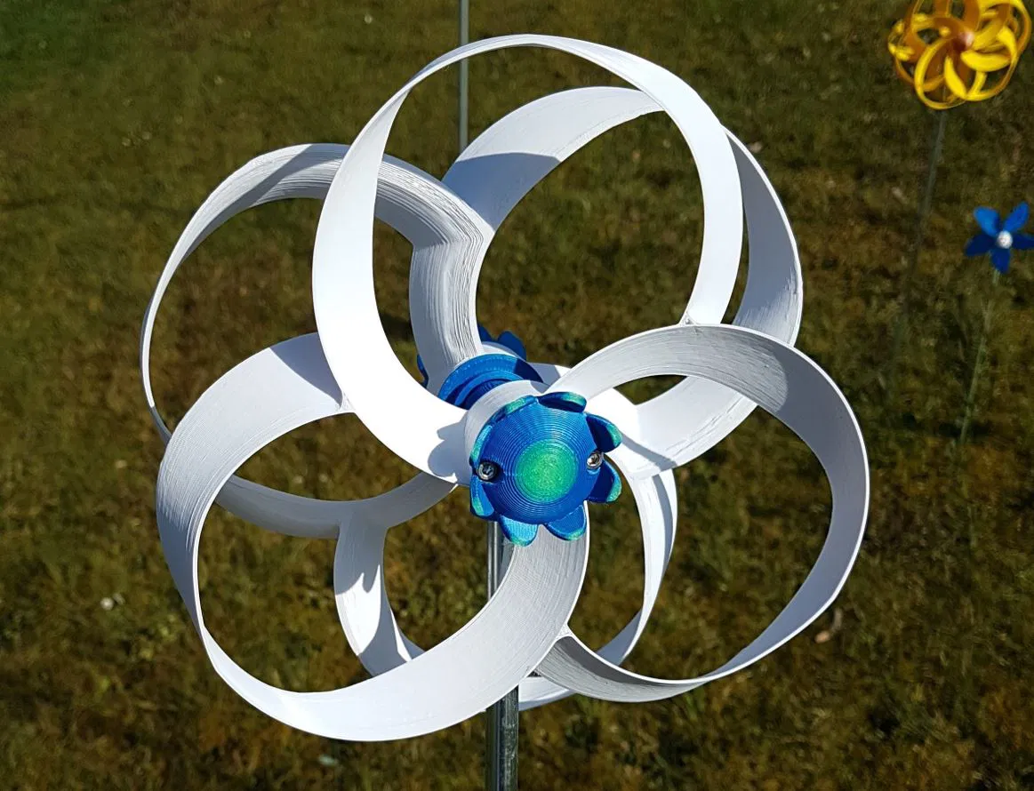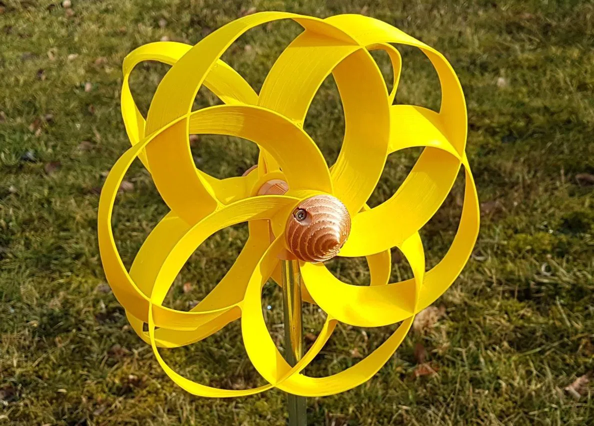 Tua bin gió hình xuyến quay ngược chiều với hiệu ứng ảo ảnh đẹp mắt. Có nhiều kích cỡ (200-250mm) và cấu hình (3x, 4x, 6x cánh quạt). Hướng dẫn lắp ráp chi tiết và khuyến nghị vật liệu in.