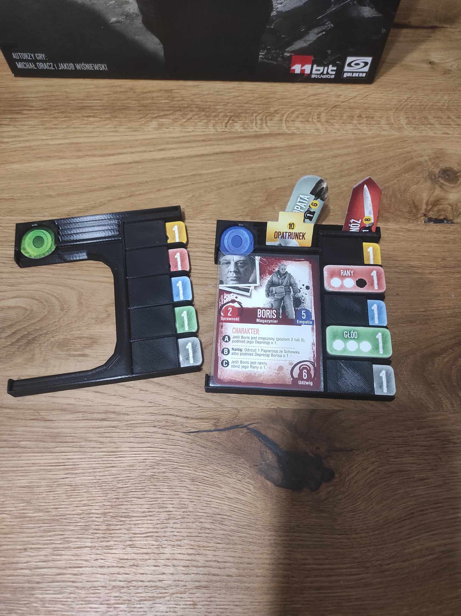 - khay đựng nhân vật - dùng làm khay đựng token trạng thái và token màu trong hộp, trong quá trình chơi có không gian cho thẻ nhân vật và một vài token (ví dụ: súng lục).