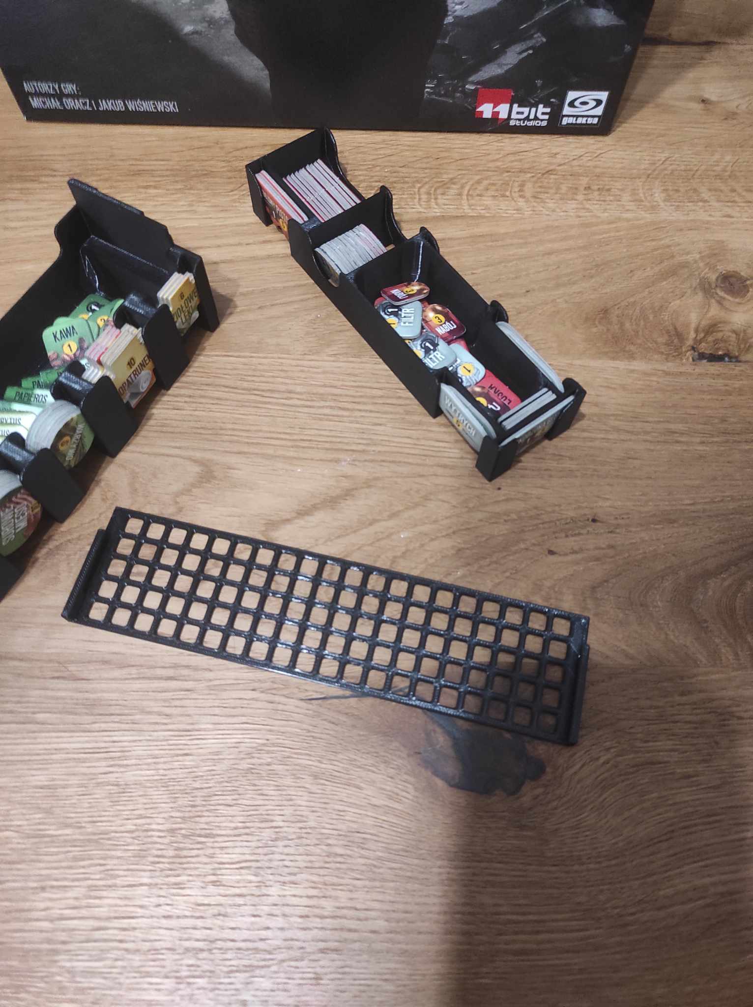 - khay đựng thẻ - mỗi bộ bài có không gian riêng, trong quá trình thiết lập, bạn chỉ cần lấy các khay ra khỏi hộp và đặt chúng lên bàn chơi.