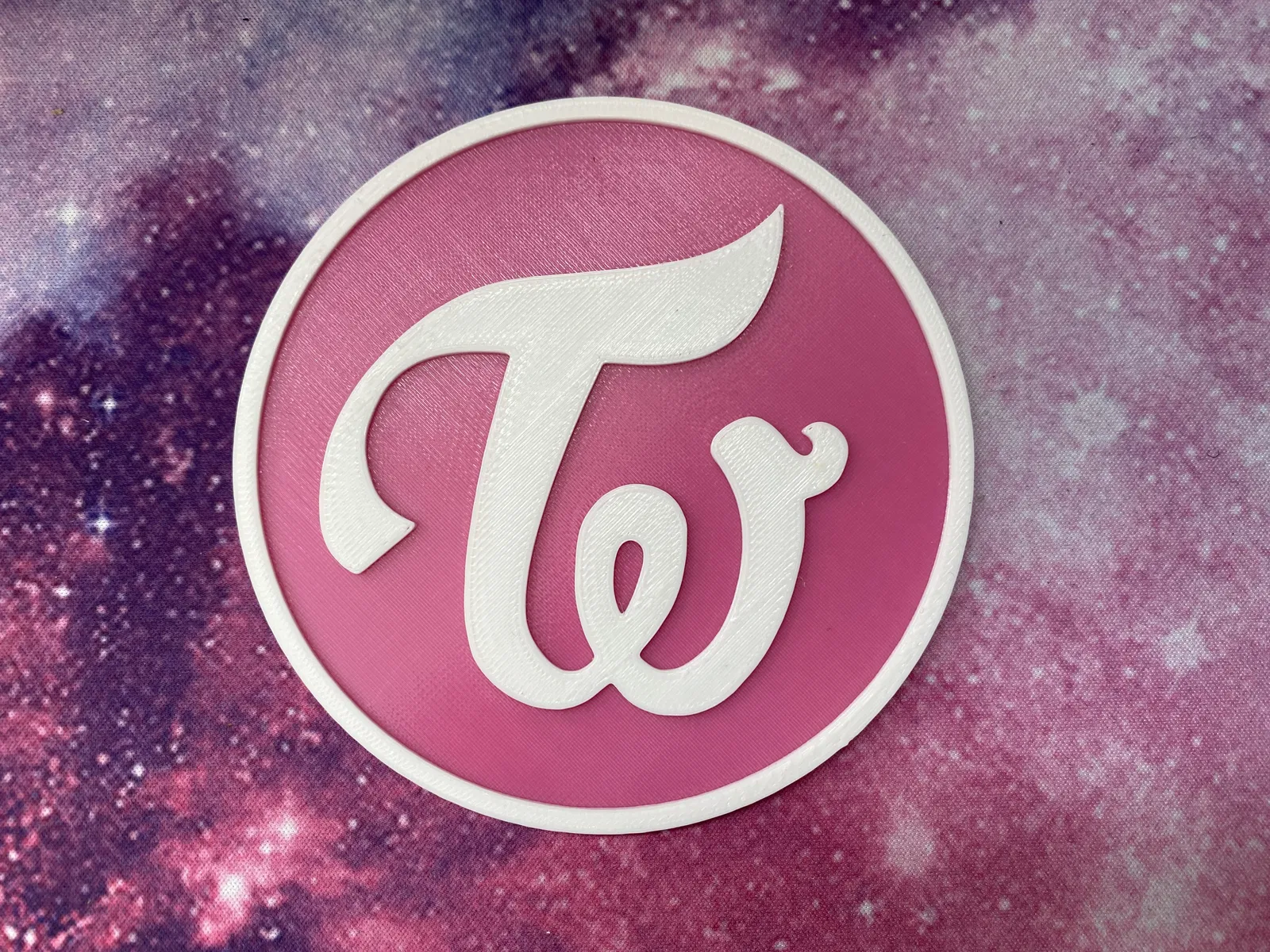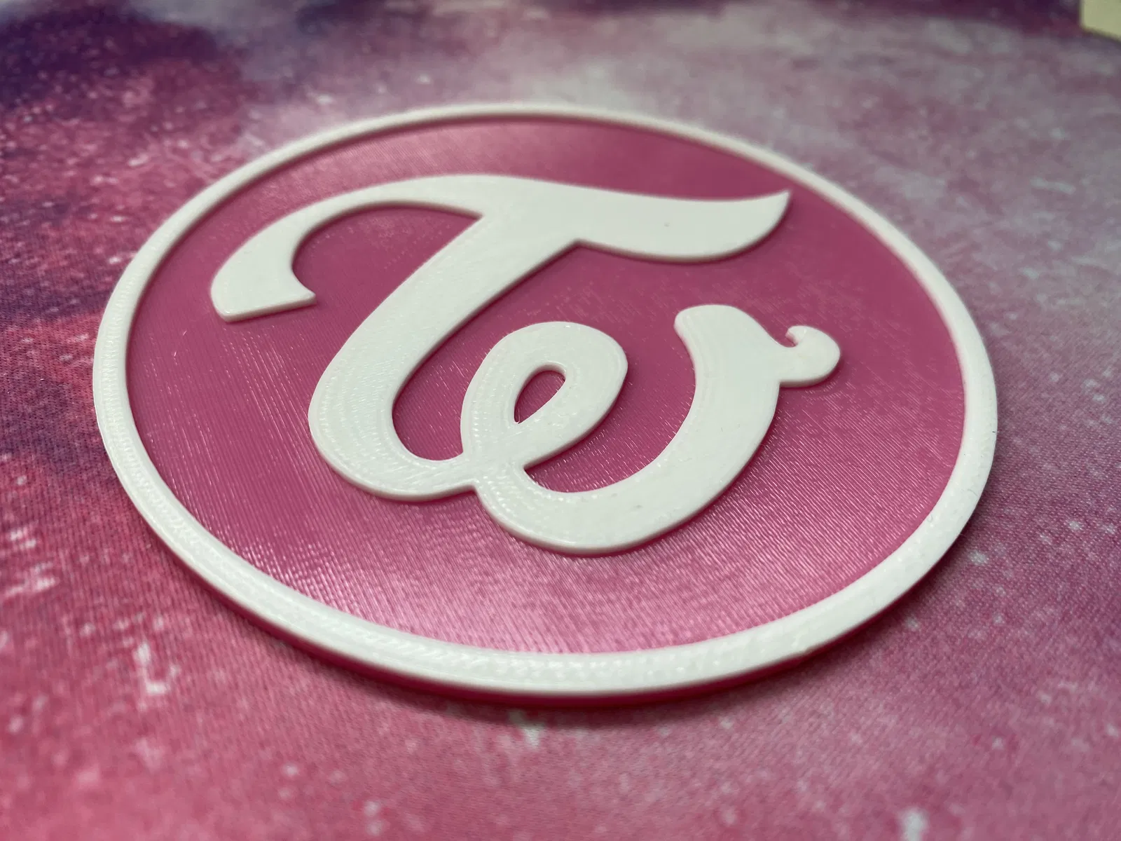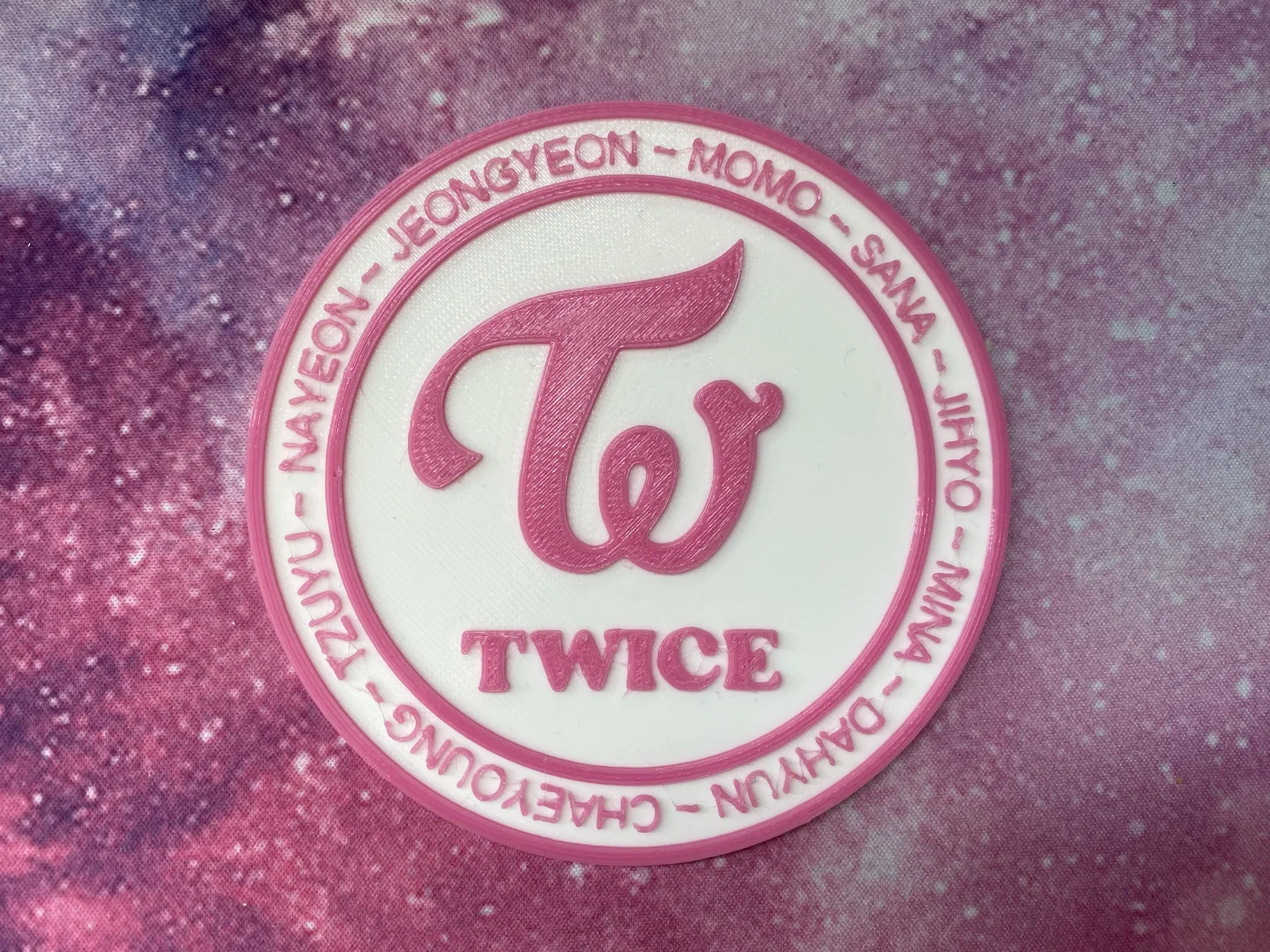 Đây là 2 mẫu lót ly TWICE mình đã làm. Một cái đơn giản chỉ có logo của nhóm, cái thứ hai thì có tên của tất cả các thành viên chạy vòng quanh. Chỉ cần đổi màu sợi nhựa (filament) sau khi in được 2mm.