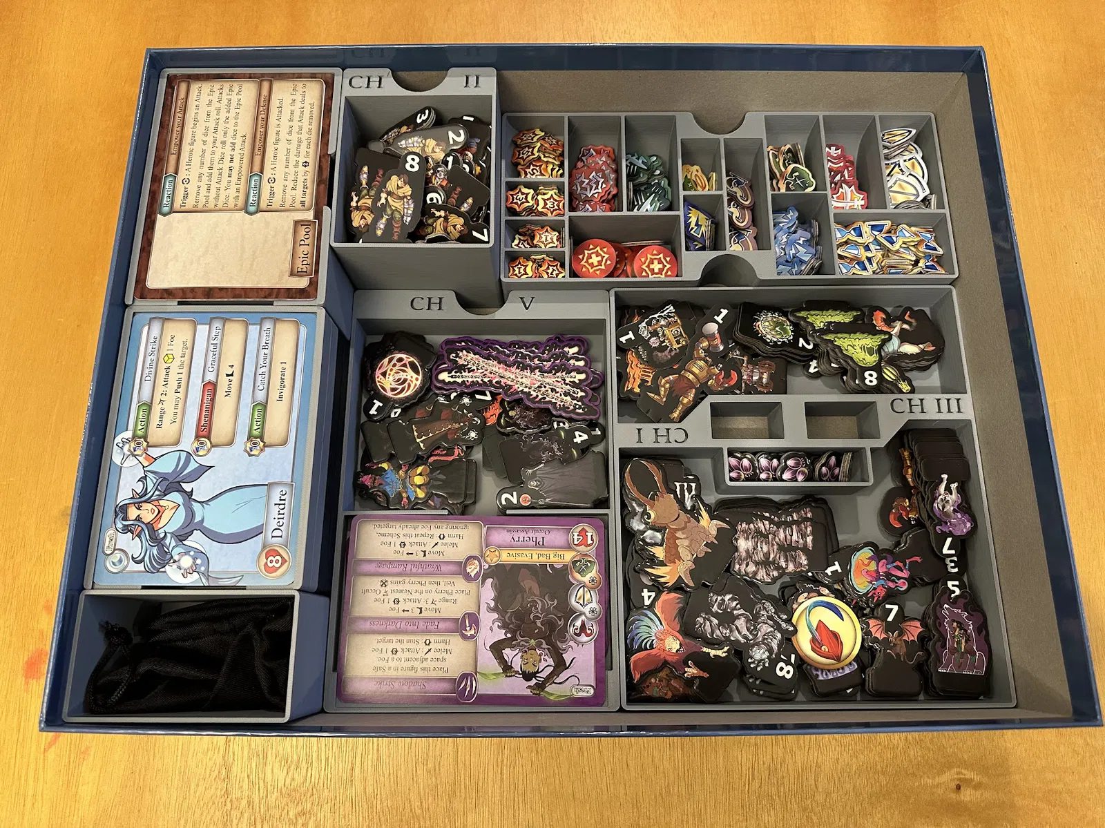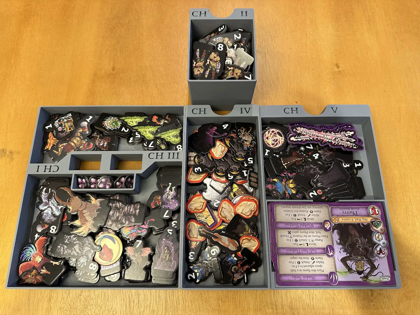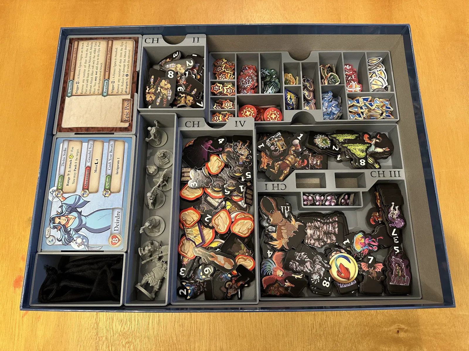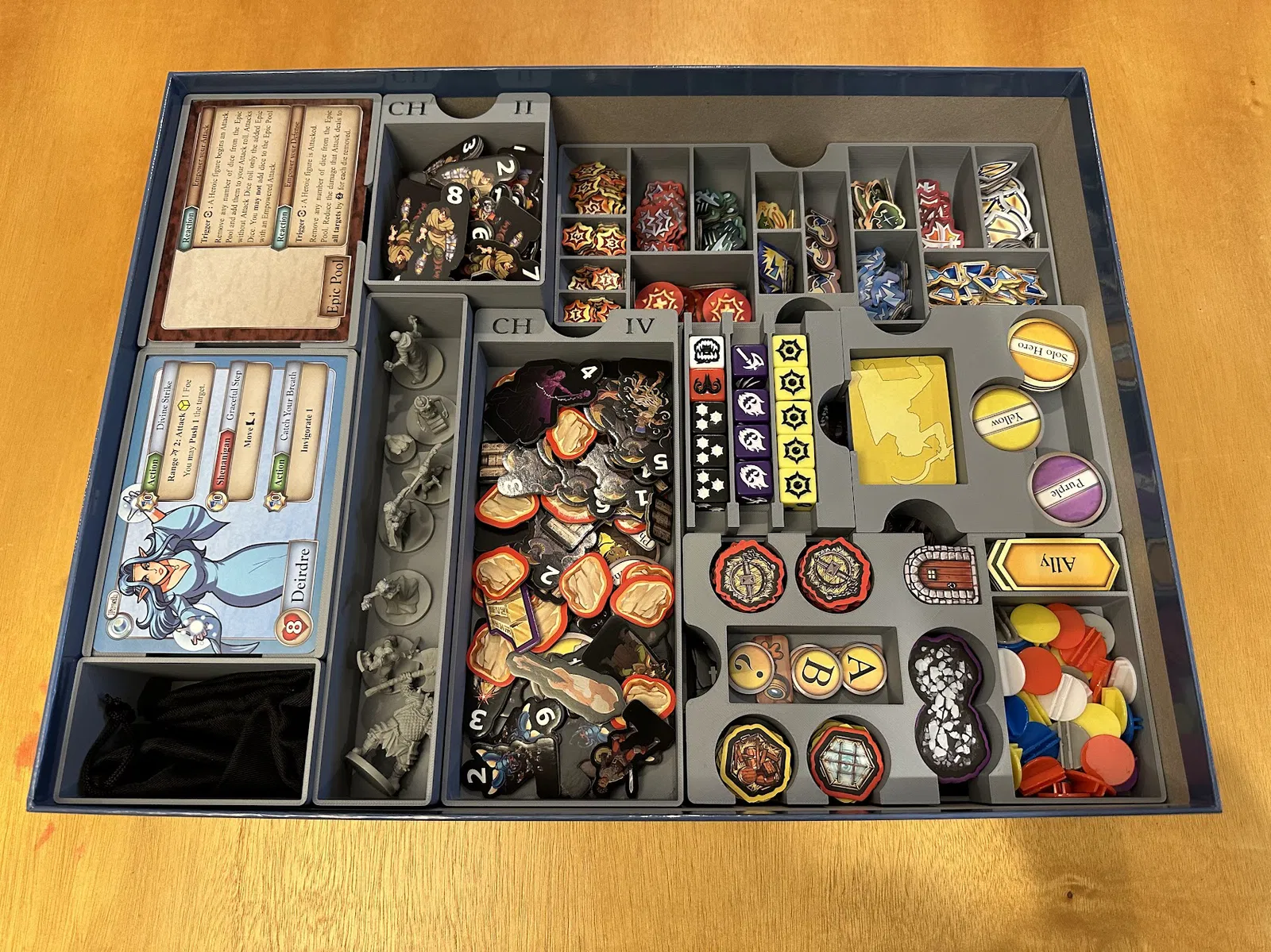 Đây là một khay đựng đồ cho Tales from the Red Dragon Inn, một game phiêu lưu dưới hầm ngục (dungeon crawler) với mức độ chơi từ thấp đến trung bình, có rất nhiều bộ phận và những nhân vật hài hước. Con cái tôi rất thích nó, nhưng việc thiết lập và dọn dẹp tốn rất nhiều túi nhỏ và tôi muốn làm cho nó sẵn sàng trên bàn chơi nhanh hơn. Nếu bạn cực kỳ nhạy cảm với spoiler, thì khay này có thể không phù hợp với bạn. Tôi quyết định mở hết 5 chương, so sánh các loại token (nếu có thể) để thêm vào kho hiện có, và đặt các standee và token đặc trưng cho từng chương còn lại vào khay riêng của chúng. Bằng cách này, bạn có thể lấy hai khay thiết lập, khay chương, khay tài nguyên, kho tiền và các khay người chơi và gần như sẵn sàng để thiết lập bản đồ.