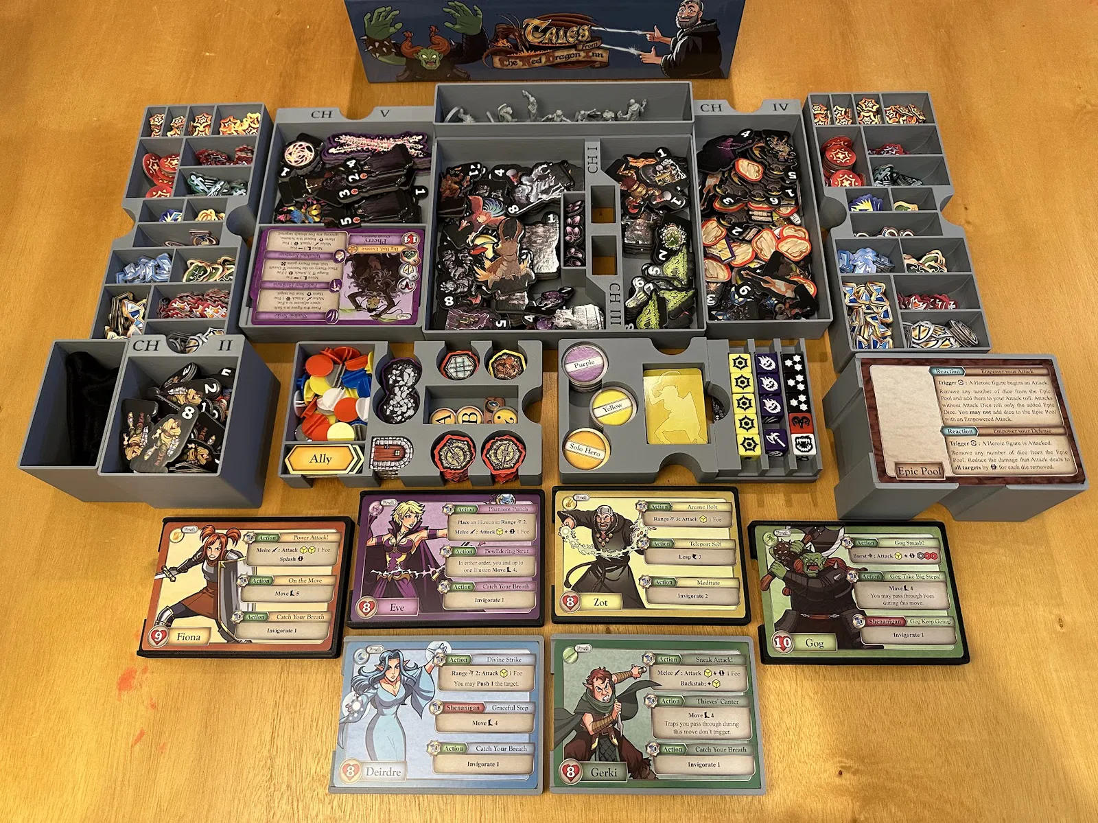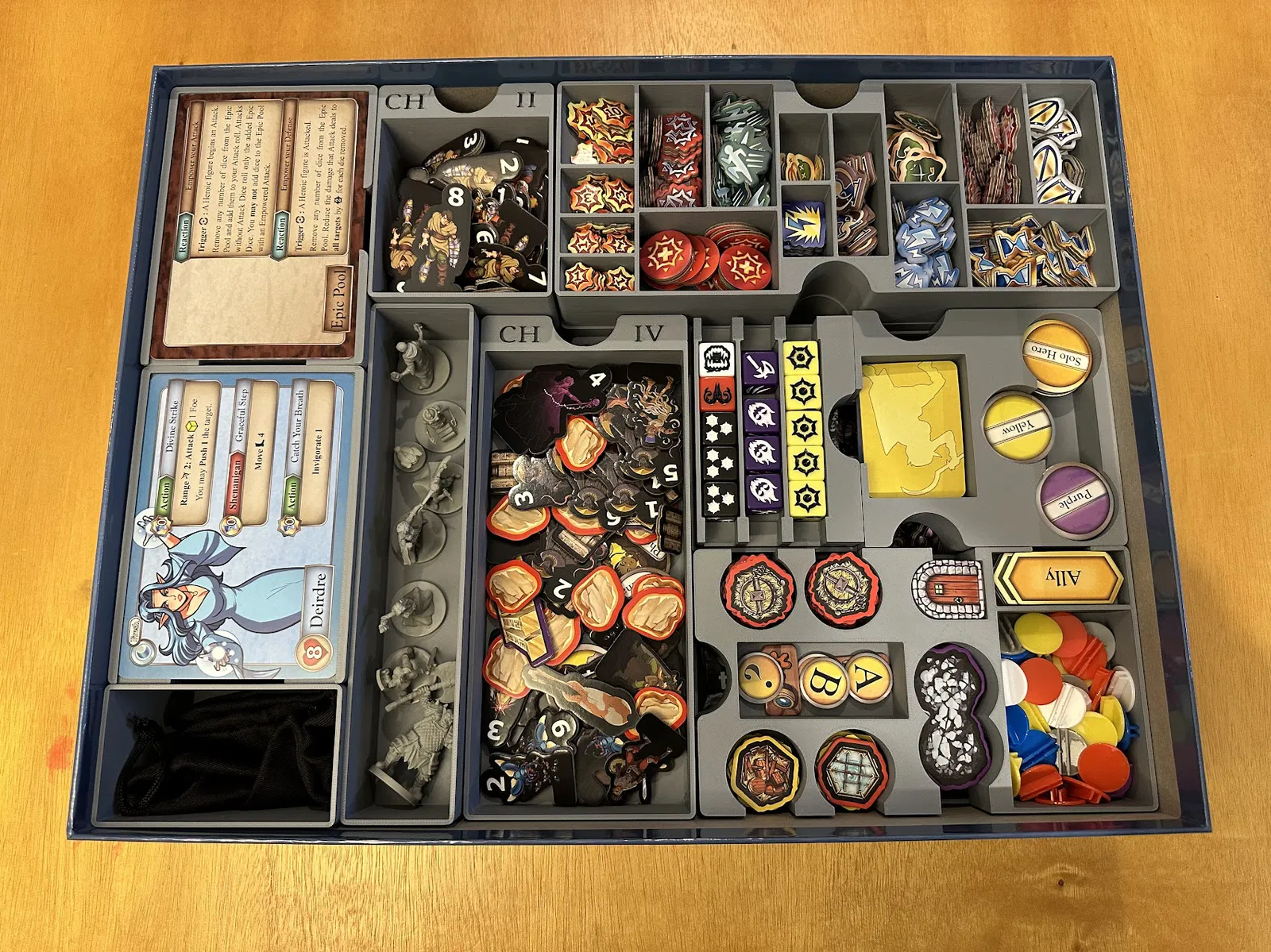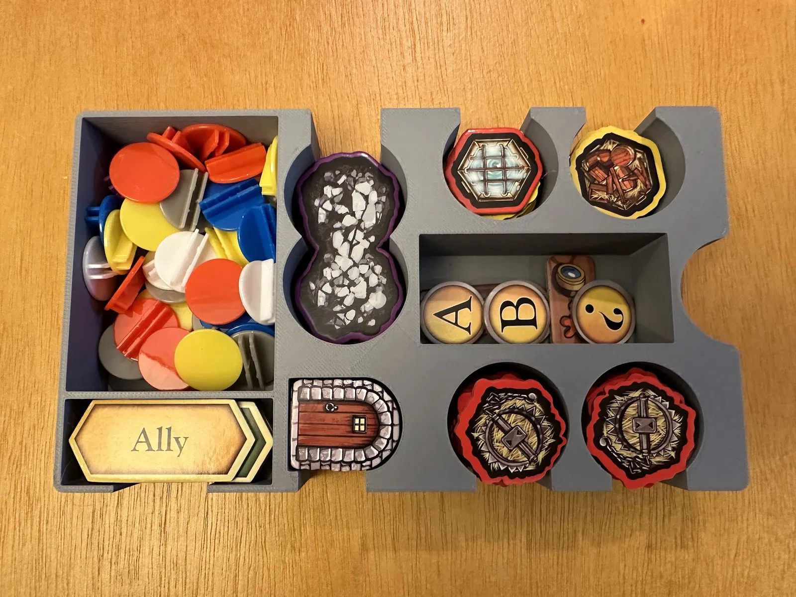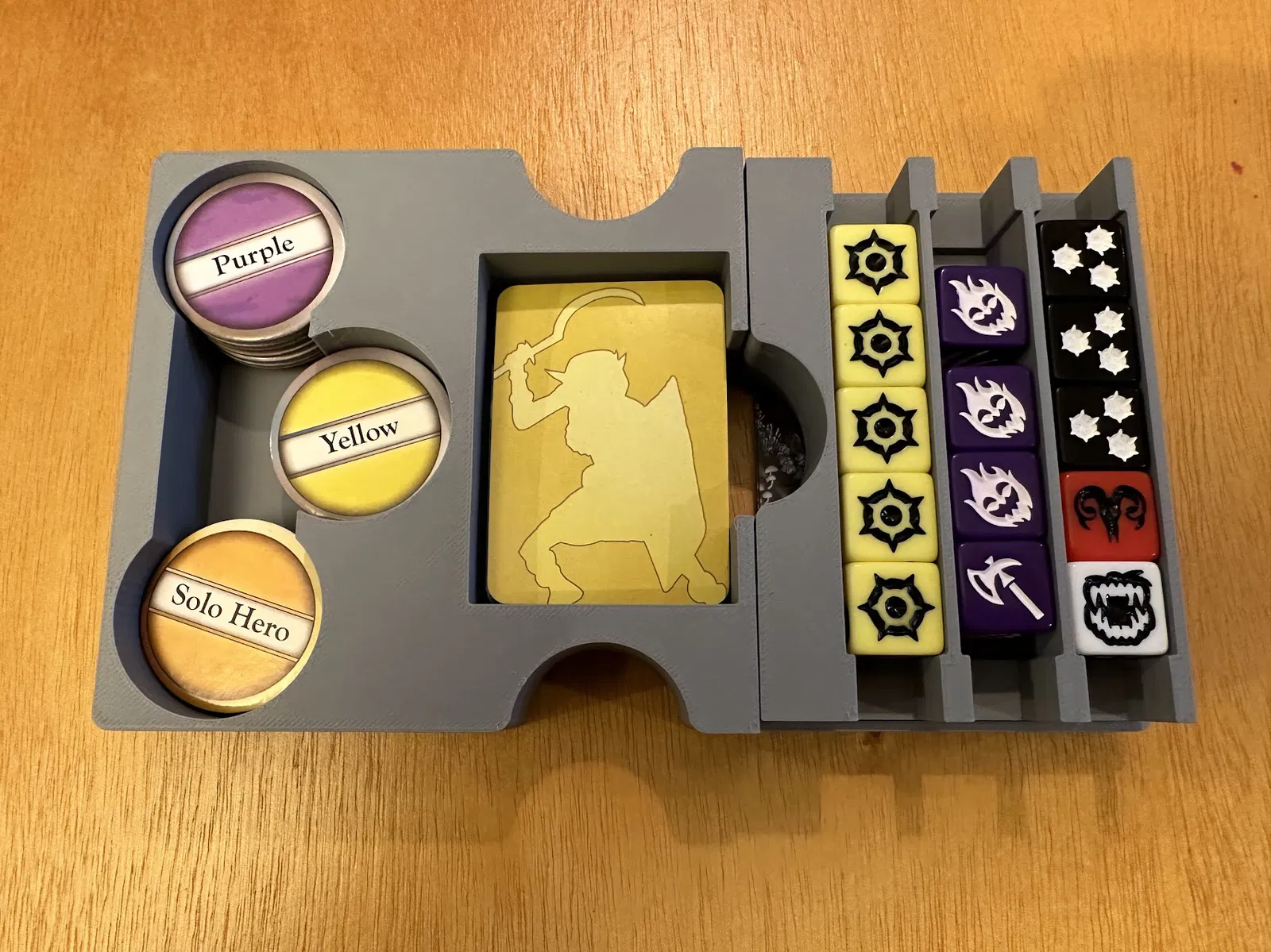 Đây là một khay đựng đồ cho Tales from the Red Dragon Inn, một game phiêu lưu dưới hầm ngục (dungeon crawler) với mức độ chơi từ thấp đến trung bình, có rất nhiều bộ phận và những nhân vật hài hước. Con cái tôi rất thích nó, nhưng việc thiết lập và dọn dẹp tốn rất nhiều túi nhỏ và tôi muốn làm cho nó sẵn sàng trên bàn chơi nhanh hơn. Nếu bạn cực kỳ nhạy cảm với spoiler, thì khay này có thể không phù hợp với bạn. Tôi quyết định mở hết 5 chương, so sánh các loại token (nếu có thể) để thêm vào kho hiện có, và đặt các standee và token đặc trưng cho từng chương còn lại vào khay riêng của chúng. Bằng cách này, bạn có thể lấy hai khay thiết lập, khay chương, khay tài nguyên, kho tiền và các khay người chơi và gần như sẵn sàng để thiết lập bản đồ.