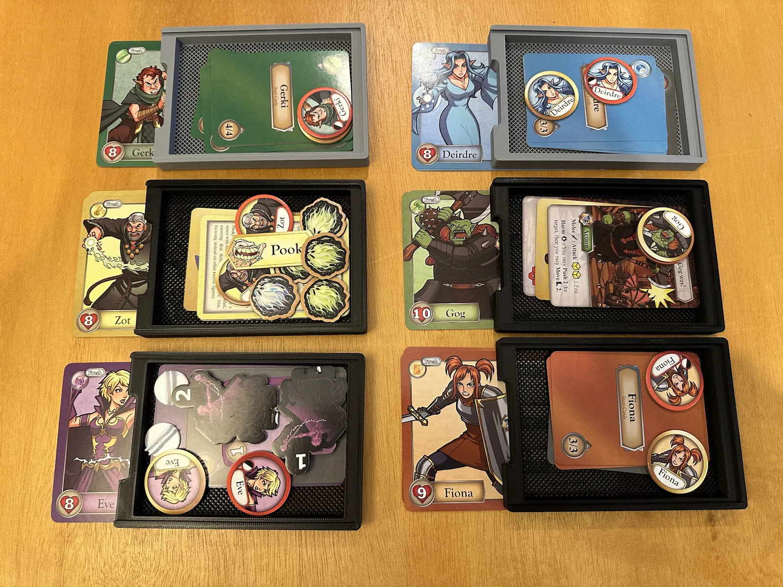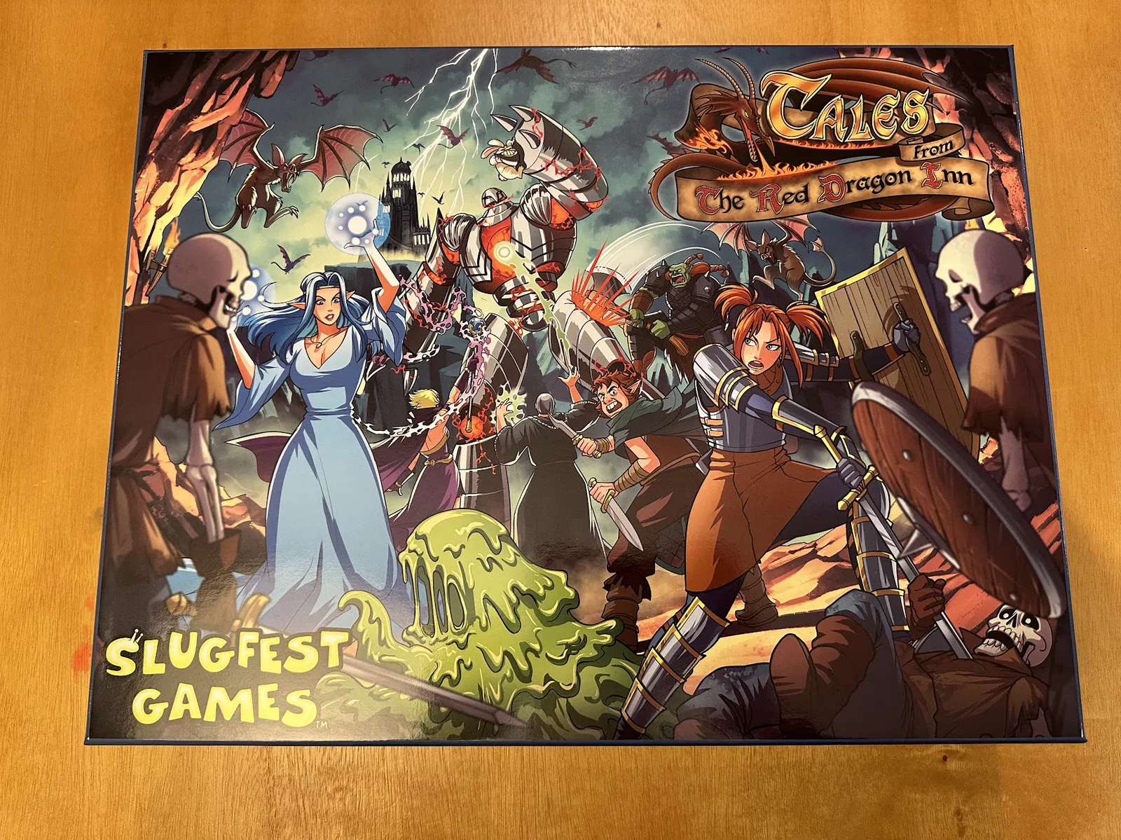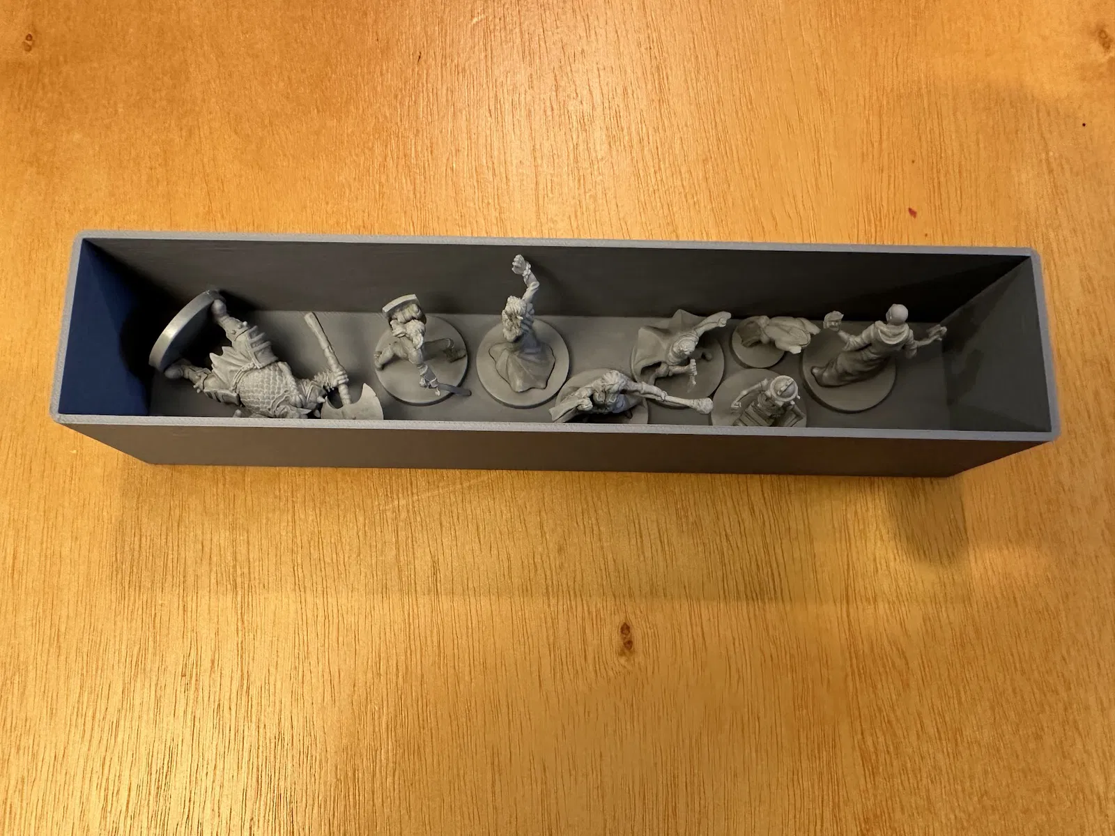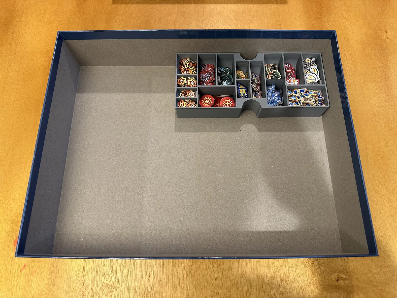 Đây là một khay đựng đồ cho Tales from the Red Dragon Inn, một game phiêu lưu dưới hầm ngục (dungeon crawler) với mức độ chơi từ thấp đến trung bình, có rất nhiều bộ phận và những nhân vật hài hước. Con cái tôi rất thích nó, nhưng việc thiết lập và dọn dẹp tốn rất nhiều túi nhỏ và tôi muốn làm cho nó sẵn sàng trên bàn chơi nhanh hơn. Nếu bạn cực kỳ nhạy cảm với spoiler, thì khay này có thể không phù hợp với bạn. Tôi quyết định mở hết 5 chương, so sánh các loại token (nếu có thể) để thêm vào kho hiện có, và đặt các standee và token đặc trưng cho từng chương còn lại vào khay riêng của chúng. Bằng cách này, bạn có thể lấy hai khay thiết lập, khay chương, khay tài nguyên, kho tiền và các khay người chơi và gần như sẵn sàng để thiết lập bản đồ.