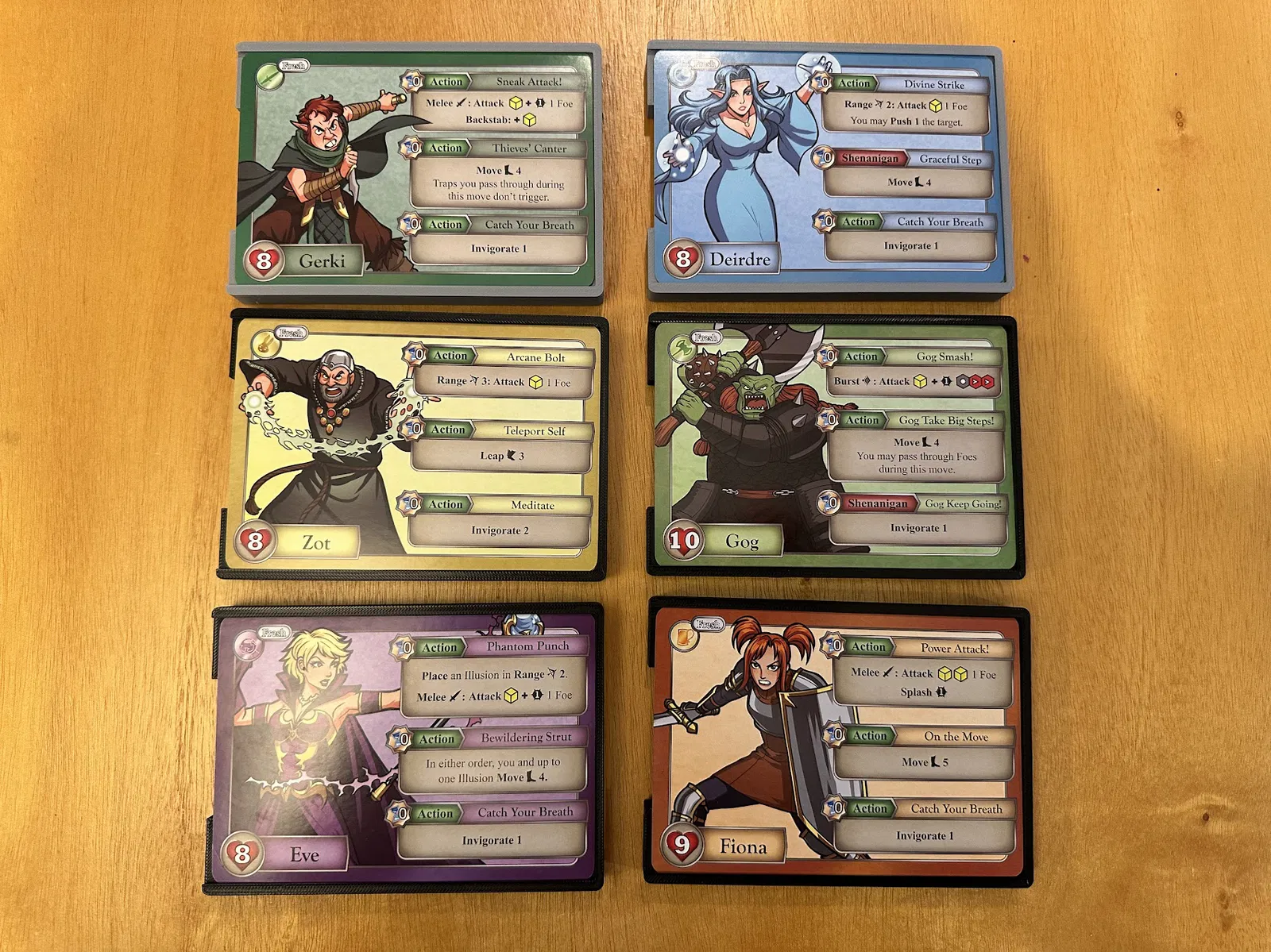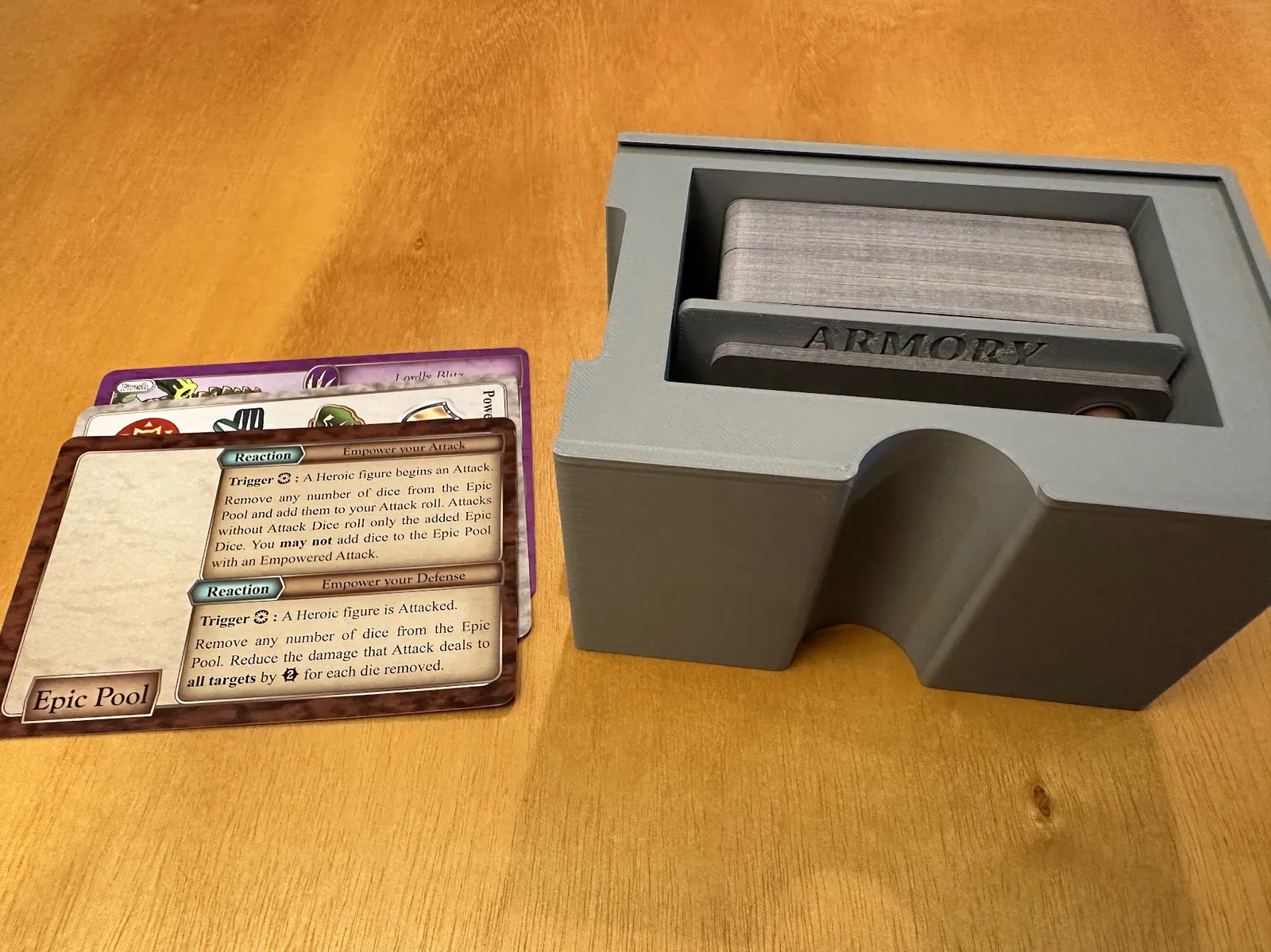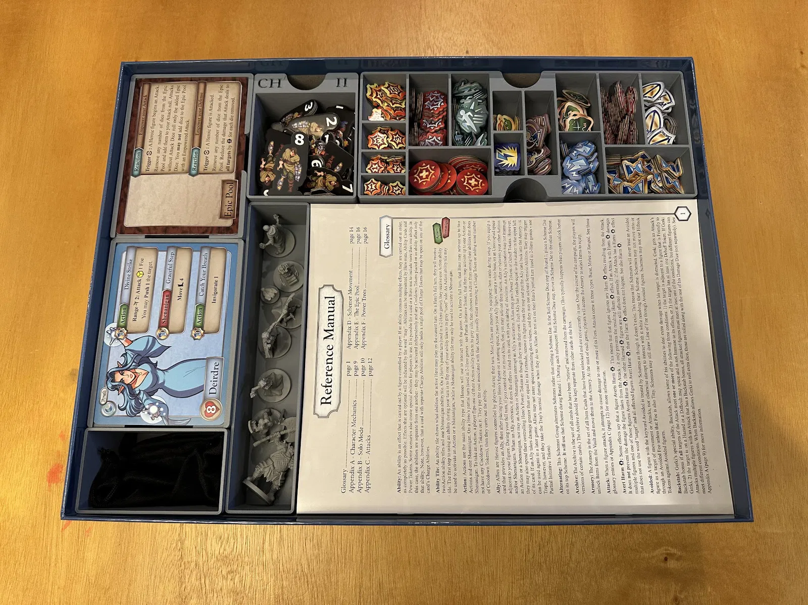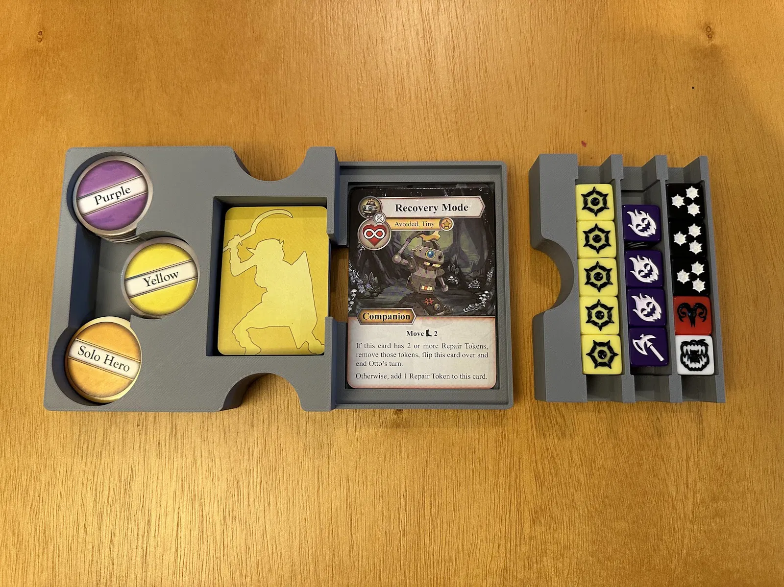Tôi đã chọn không bọc bài vì chúng không được xử lý nhiều, và không gian tổng thể gần như là có hạn với số lượng bộ phận như vậy. Khay xúc xắc được đặt gọn vào khay thiết lập kẻ địch, nằm trên các thẻ chơi solo.