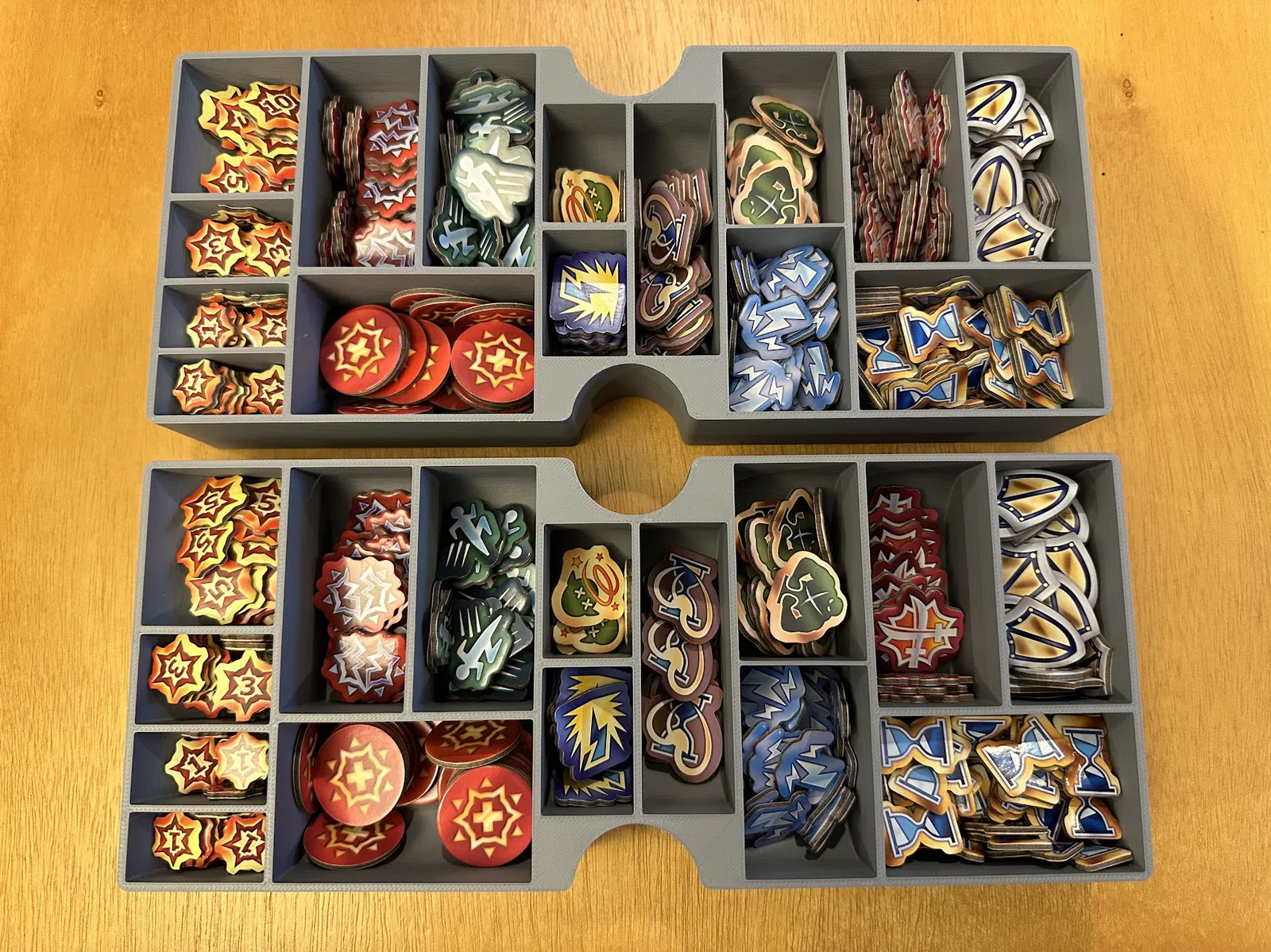 Bạn sẽ cần 2 khay tài nguyên, 6 khay người chơi và 1 cái cho mọi thứ còn lại. Mọi thứ được hiển thị đều được in với chiều cao lớp 0.2mm, đầu phun 0.4mm. Các khay lớn và kho tiền có 10% infill, các khay còn lại có 15% infill. Tôi không có kế hoạch lưu trữ theo chiều dọc, nhưng nó sẽ giữ mọi thứ ổn định mà không gặp vấn đề gì nếu bạn quyết định làm vậy.