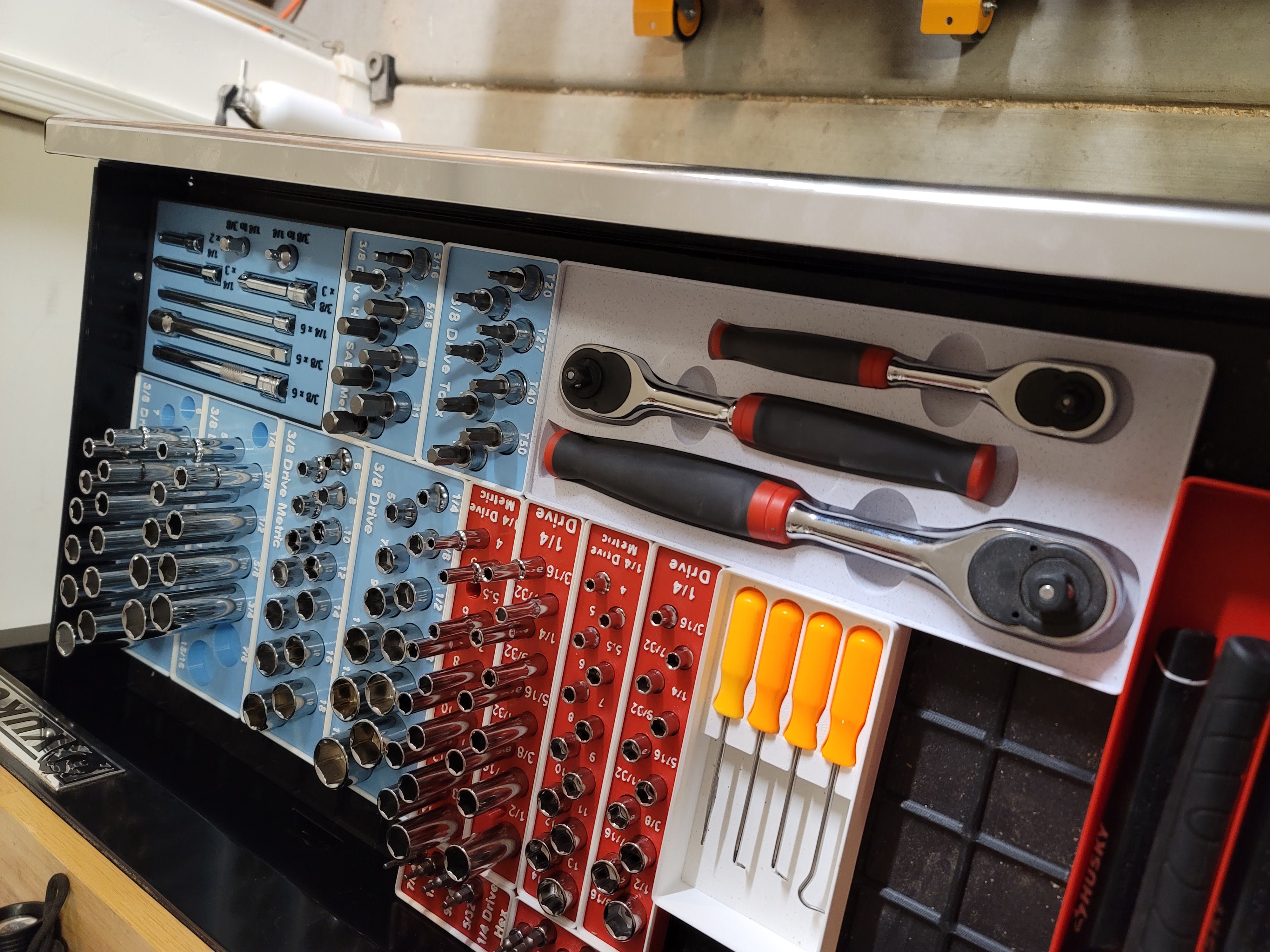 Kệ giữ cờ lê/tay công 12 cạnh tương thích với hệ thống Gridfinity. Bộ tổ chức này có kích thước 3x7 ô lưới Gridfinity. Nó được thiết kế để giữ các loại cờ lê 1/4", 3/8", và 1/2" của hãng Crescent, nhưng có thể dùng với các loại khác. Link đến các tay công cụ thể của tôi ở bên dưới. Hãy xem hồ sơ của tôi để tìm các kệ giữ tuýp đi kèm trong ảnh nhé.