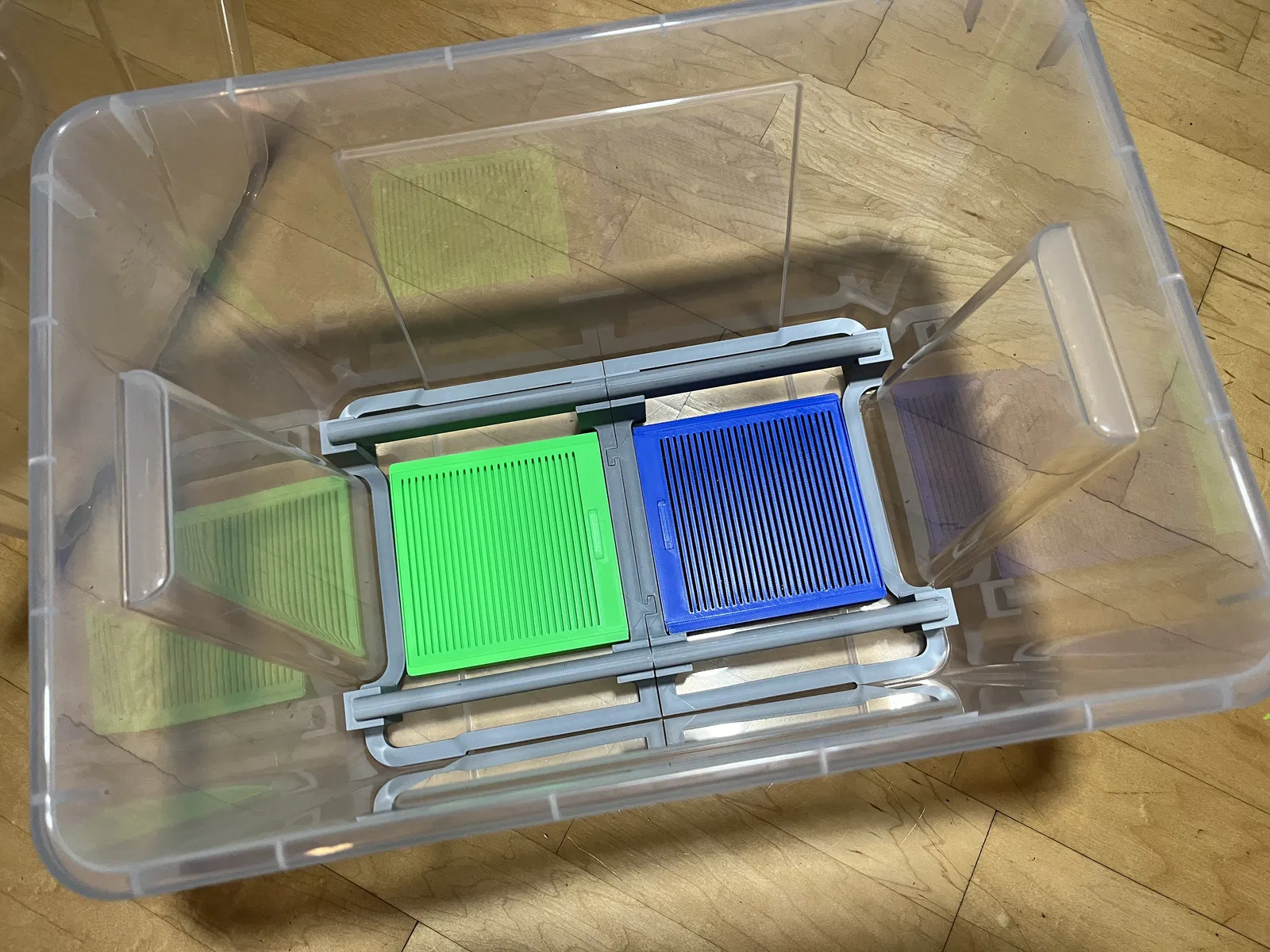 Hai hộp này, mỗi hộp chứa 78 gram hạt silica gel có đường kính >1.5mm, là vừa khít vào khung đáy của giá đỡ con lăn - tui dùng loại silica gel có thể tái sinh với hạt 2-3mm. Hộp có thể dễ dàng cho vào và lấy ra với một khoảng hở nhỏ.