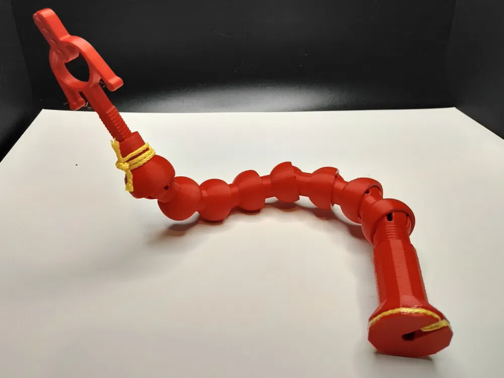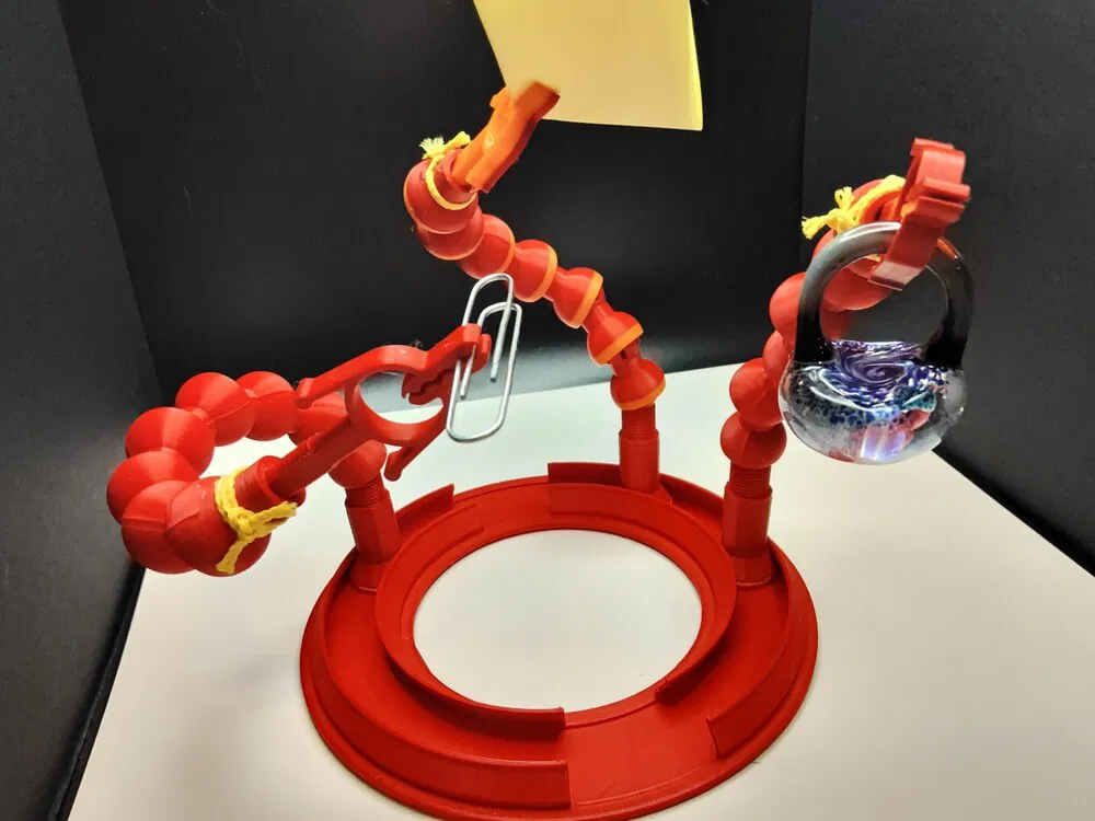 Đây là bản thử nghiệm cho "helping hands" (bàn tay hỗ trợ). Ý tưởng là luồn dây dù qua các bộ phận để tạo thành một cánh tay có thể điều chỉnh độ siết bằng cách xoay đế. Hữu ích cho việc giữ đồ vật hoặc làm mô hình.