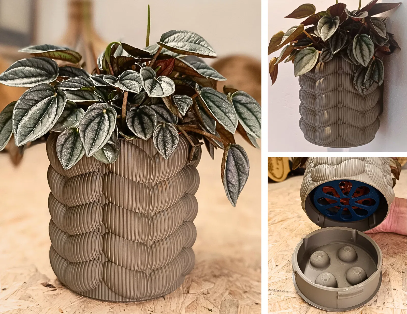 Chậu cây treo tường có khay thoát nước ẩn và tùy chọn giá đỡ. Có thể in dễ dàng mà không cần giá đỡ (trừ giá treo tường tùy chọn). In bằng sợi Jayo matte clay.