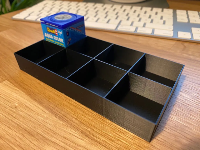 Mình cần một cái kệ để đựng mấy hũ sơn Revell Aqua Color đang lung tung trong hộp đồ nghề. In bằng PLA, độ cao lớp 0.2mm, tốc độ 60 mm/s, không cần support, đơn giản thôi ;-)