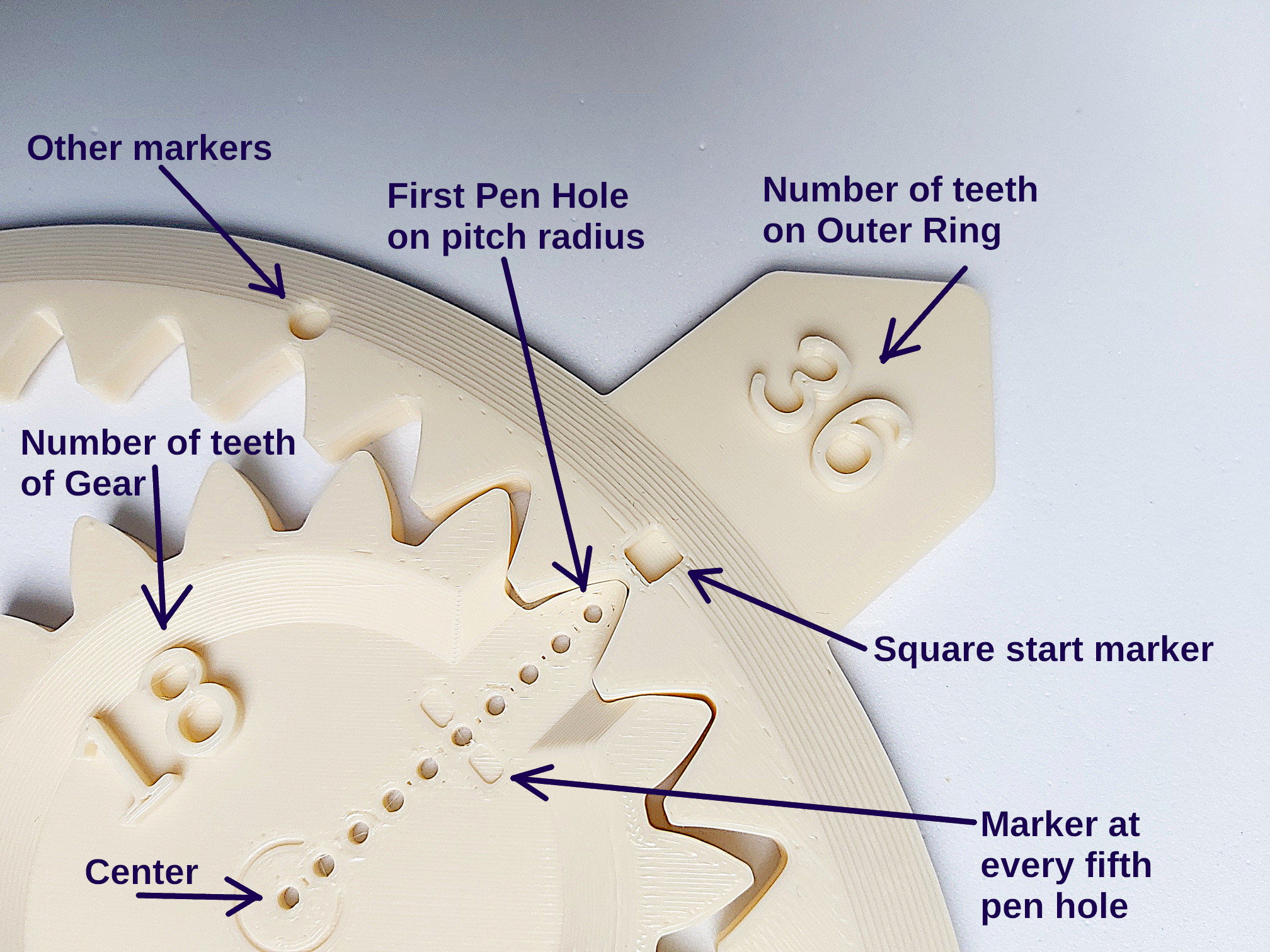 Tất cả các bánh răng đều có lỗ bút bắt đầu tại bán kính chia của vòng tròn ảo và tất cả các lỗ bút đều cách đều nhau và có các điểm đánh dấu trên vành ngoài. Vị trí đầu tiên trên vành ngoài có hình vuông.