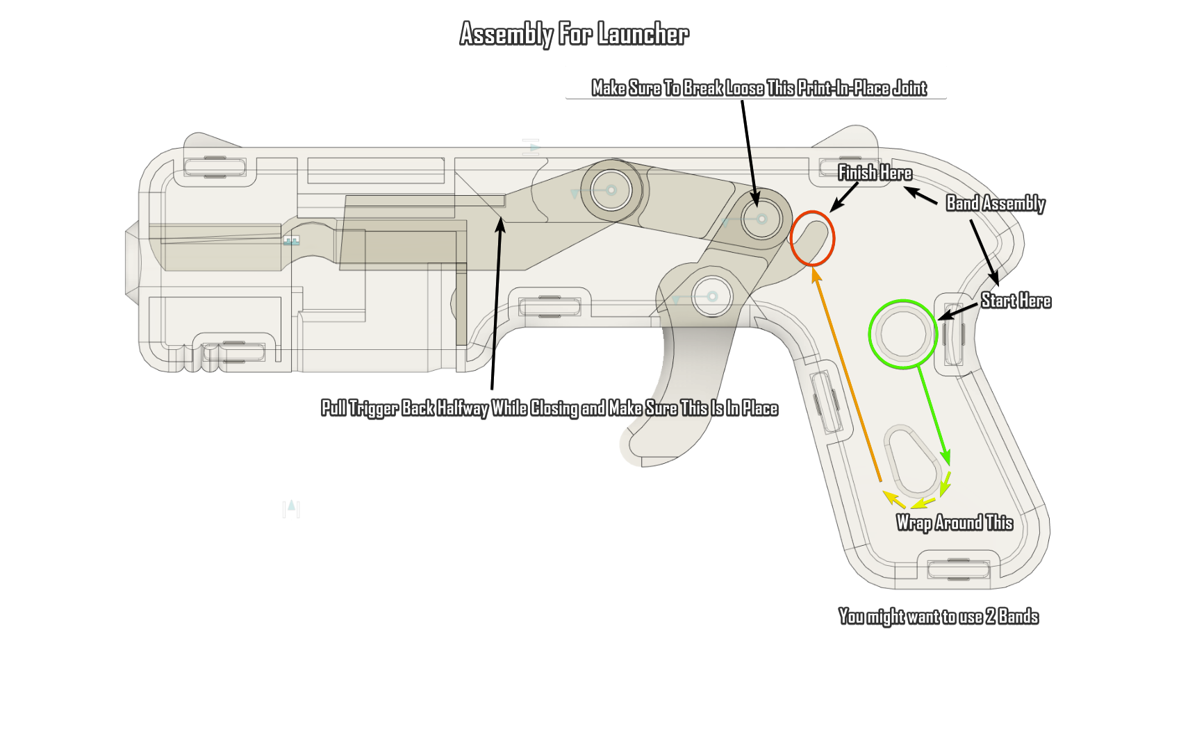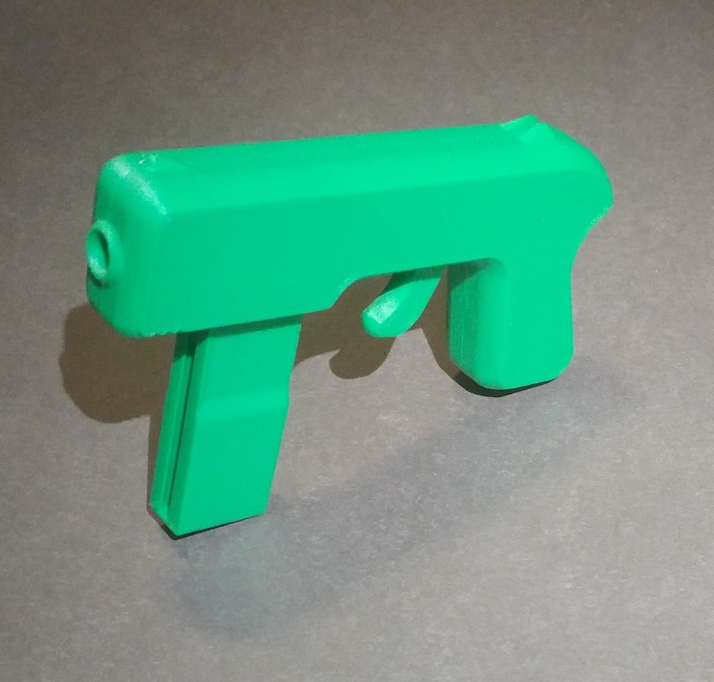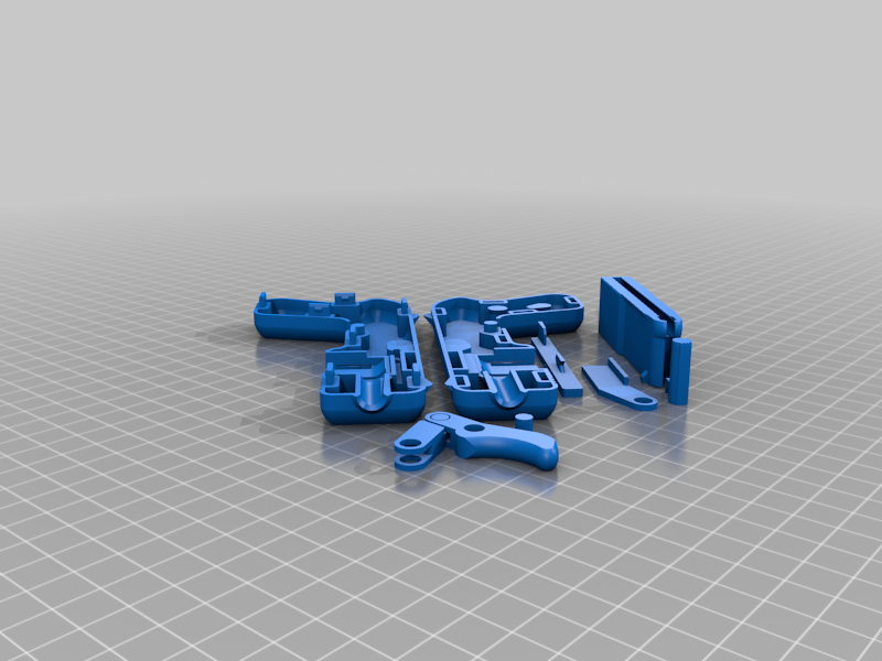 Tóm tắt Khẩu Blaster đồ chơi tí hon. Nó bắn xa khoảng 30 feet, khá nhỏ và được làm hoàn toàn từ nhựa in 3D cùng hai sợi dây thun (một cho cò súng và một cho băng đạn). Nó không cần bất kỳ ốc vít hay keo dán nào, chỉ dùng các chốt in 3D để nối phần vỏ hình vỏ sò. Nó tốn khoảng 45 gram filament, có thể in bằng PLA và chỉ có một bộ phận cần hỗ trợ (dễ dàng tháo rời và nằm ở cò súng). Băng đạn tự động kẹp vào và rút ra. Nó bắn đạn airsoft 6mm. Xuất bản từ bài đăng gốc của tôi trên Thingiverse ### Cập nhật V2 * Tầm bắn tăng