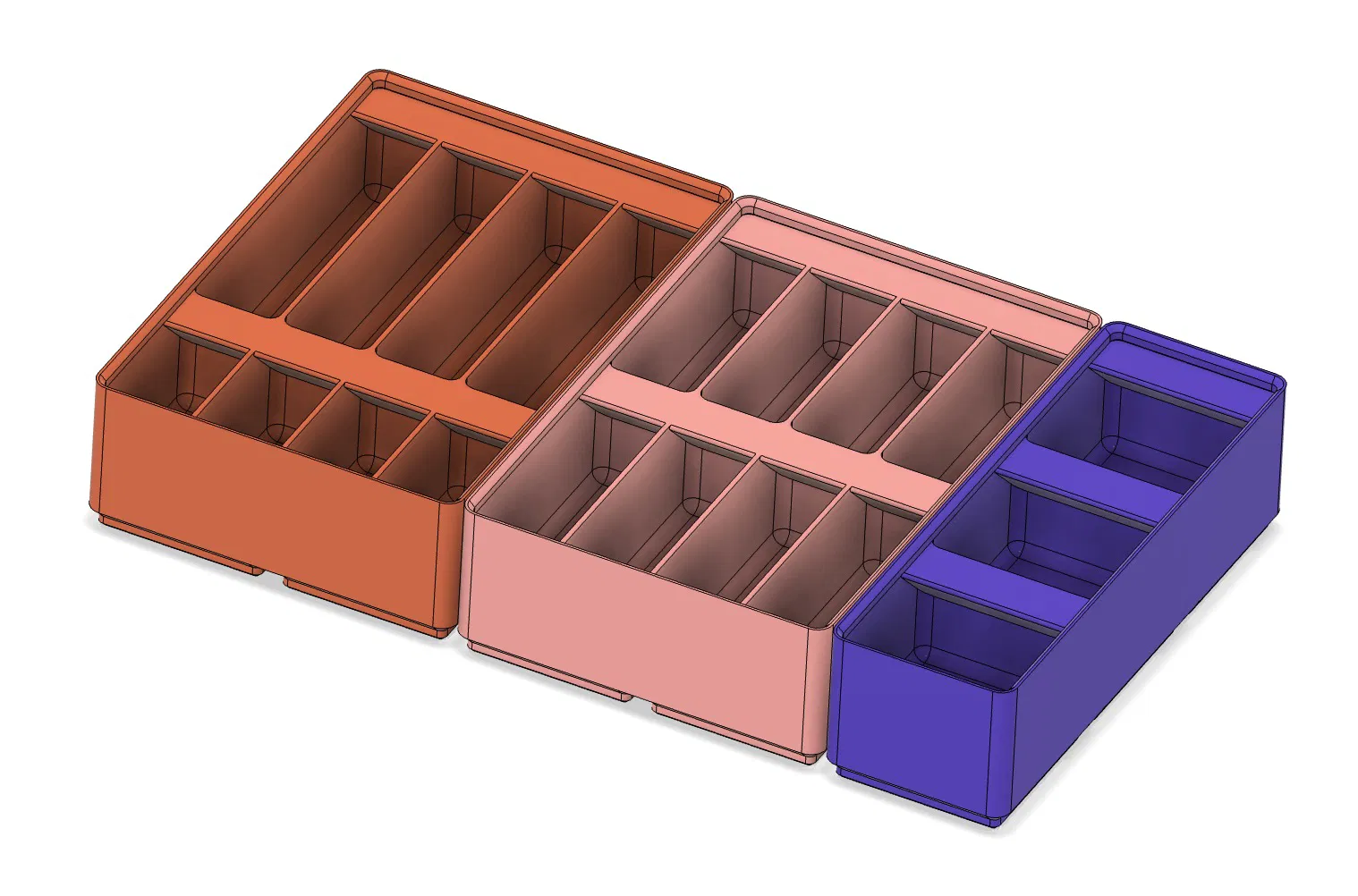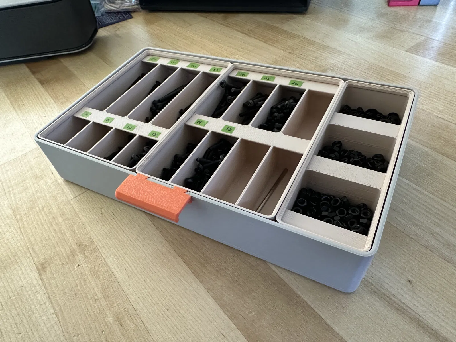 Thêm các loại hũ đựng vừa với Hệ thống ngăn kéo dạng module Gridfinity của Chipp Walters. Mấy cái này có vách ngăn nhỏ hơn mà tui dùng để đựng ốc vít, và được tạo bằng Fusion Gridfinity Generator.