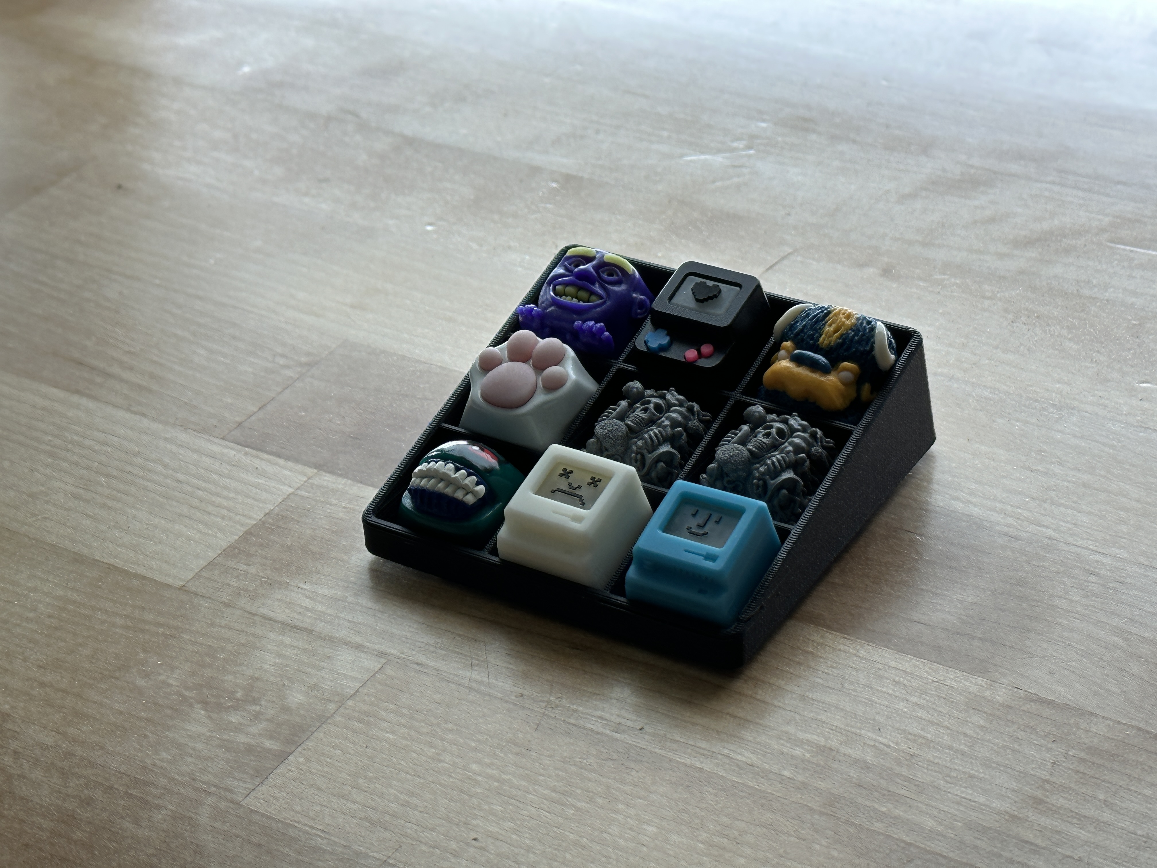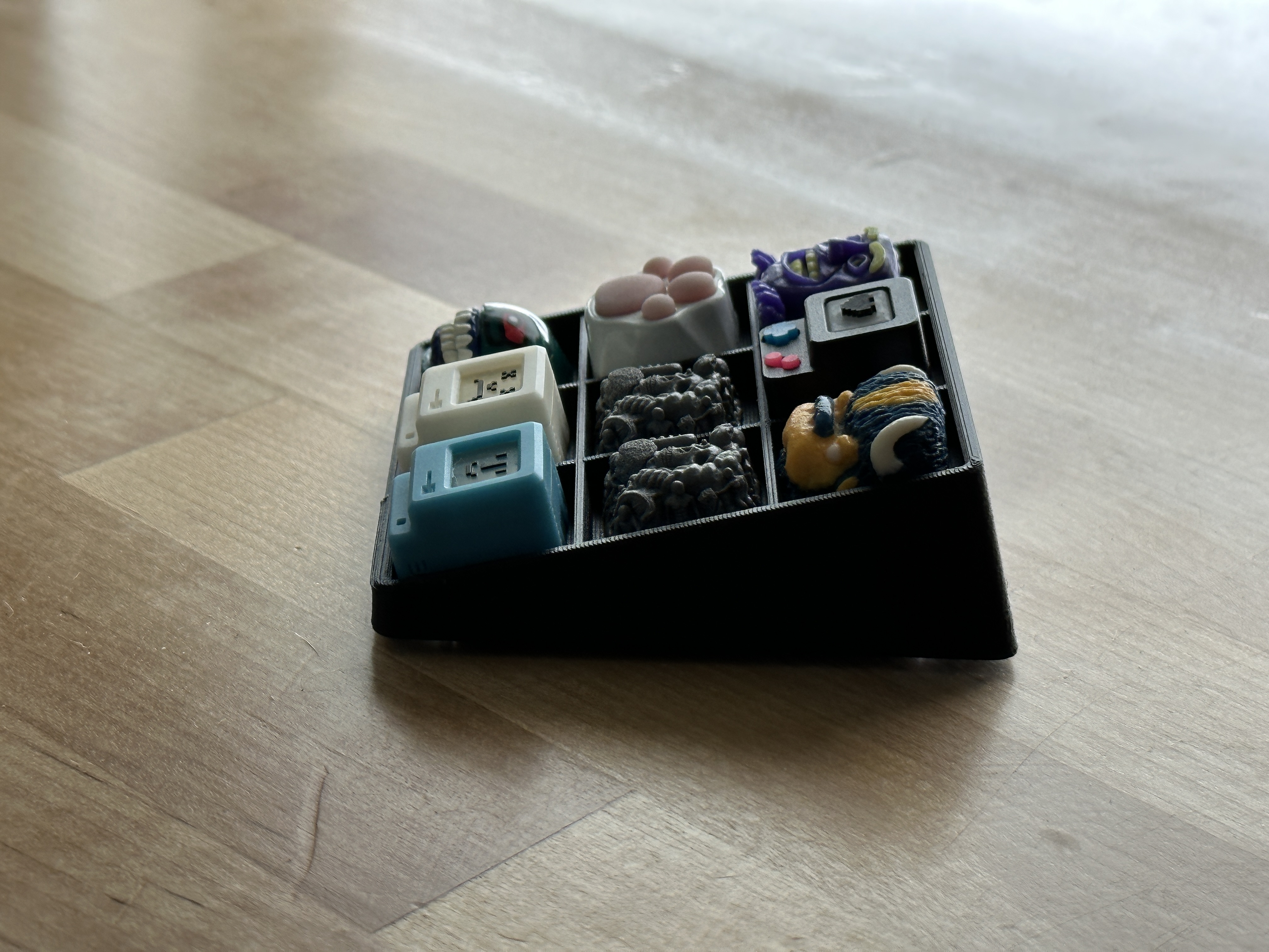 Một cái đế/hộp 3x3 để trưng bày keycap artisan của bạn trên bàn làm việc. Góc nghiêng là 15 độ.