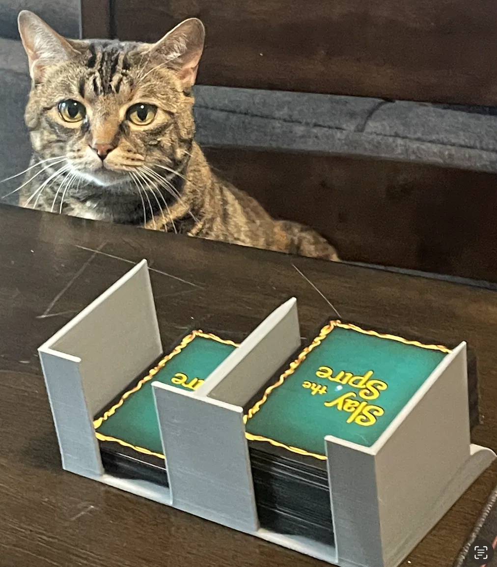Cái hộp đựng thẻ bài thưởng này là dành cho board game Slay the Spire. Bạn có thể dễ dàng lấy thẻ bài ở trên và bỏ những thẻ không chọn xuống dưới. Người dùng còn dự định làm thêm cho thẻ Act và các vật phẩm khác.