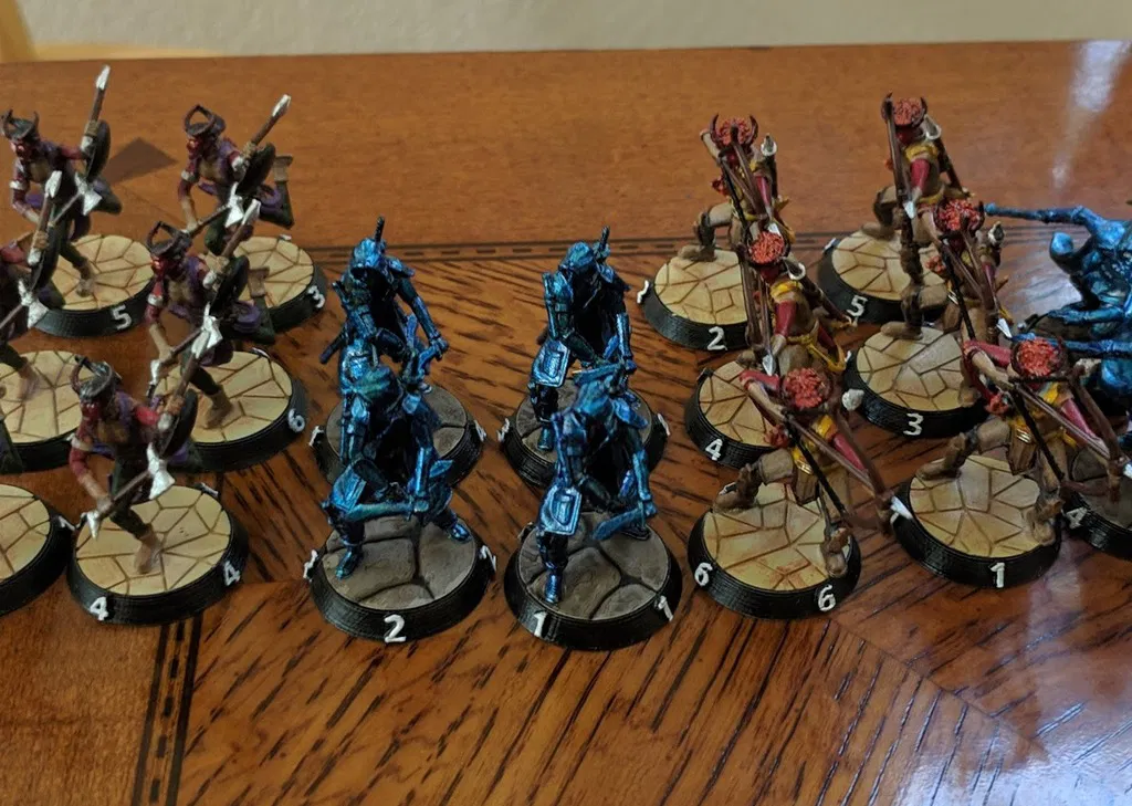 Tôi đã bao gồm các đế có số từ 1 đến 10, cũng như các đế không đánh số cao 4mm và 2mm cho các nhân vật người chơi. Ngoài ra còn có con dấu Elite, có lỗ được định cỡ cho nam châm để có thể dễ dàng gắn hoặc tháo ra khỏi các đế có số để hiển thị kẻ thù có một số loại trạng thái đặc biệt.