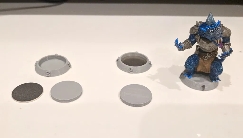 Cải tiến đế mô hình RPG 25mm cho Gloomhaven và các trò chơi khác! Đế mới có khoang cho đĩa thép 19mm, số lớn hơn ở bên cạnh, chiều cao 4mm và thiết kế dễ in hơn. Có các tùy chọn có số, không số và mặt trên có họa tiết.