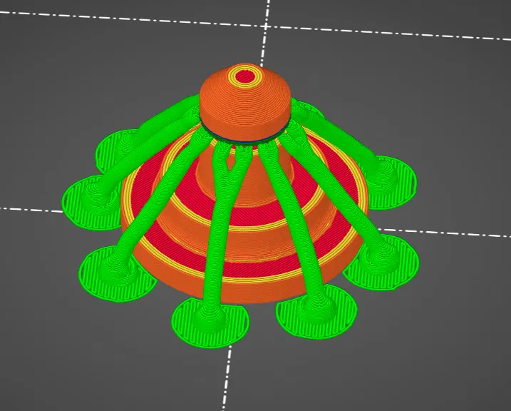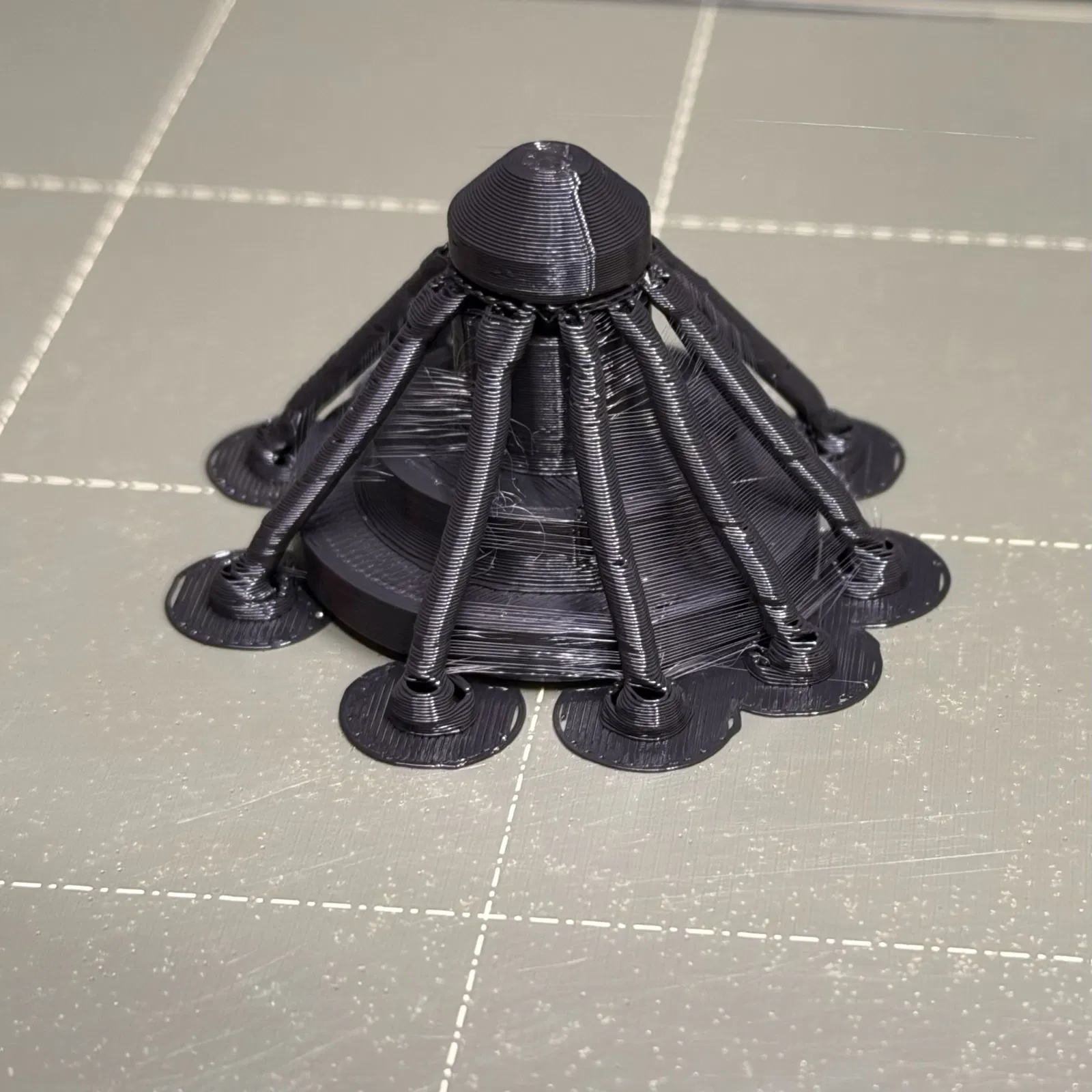 In bằng PLA (PETG có thể tốt hơn) với độ cao lớp 0.20 mm. Tôi in 4 lớp thành và dùng hỗ trợ hữu cơ chỉ trên mâm in (có thể không cần thiết... trong quá trình thử nghiệm cách phối lại cái này, tôi bắt đầu làm hỗ trợ, nhưng tôi không nghĩ đó là yếu tố khác biệt cho sự thành công của nó).