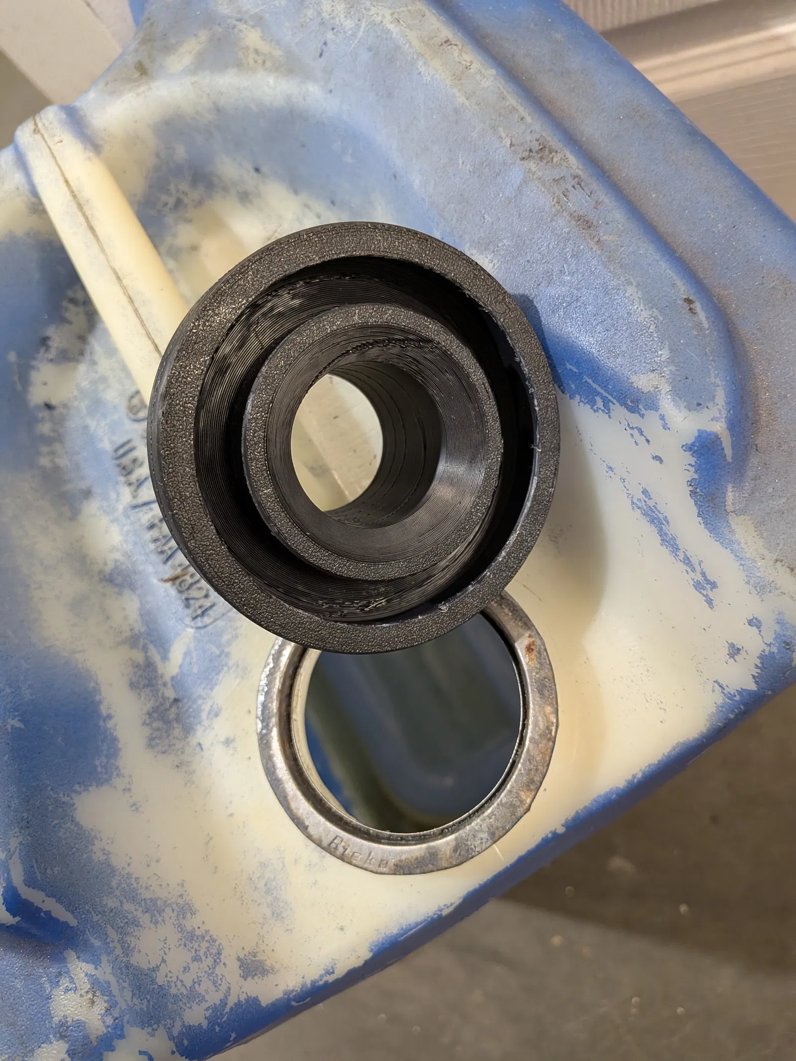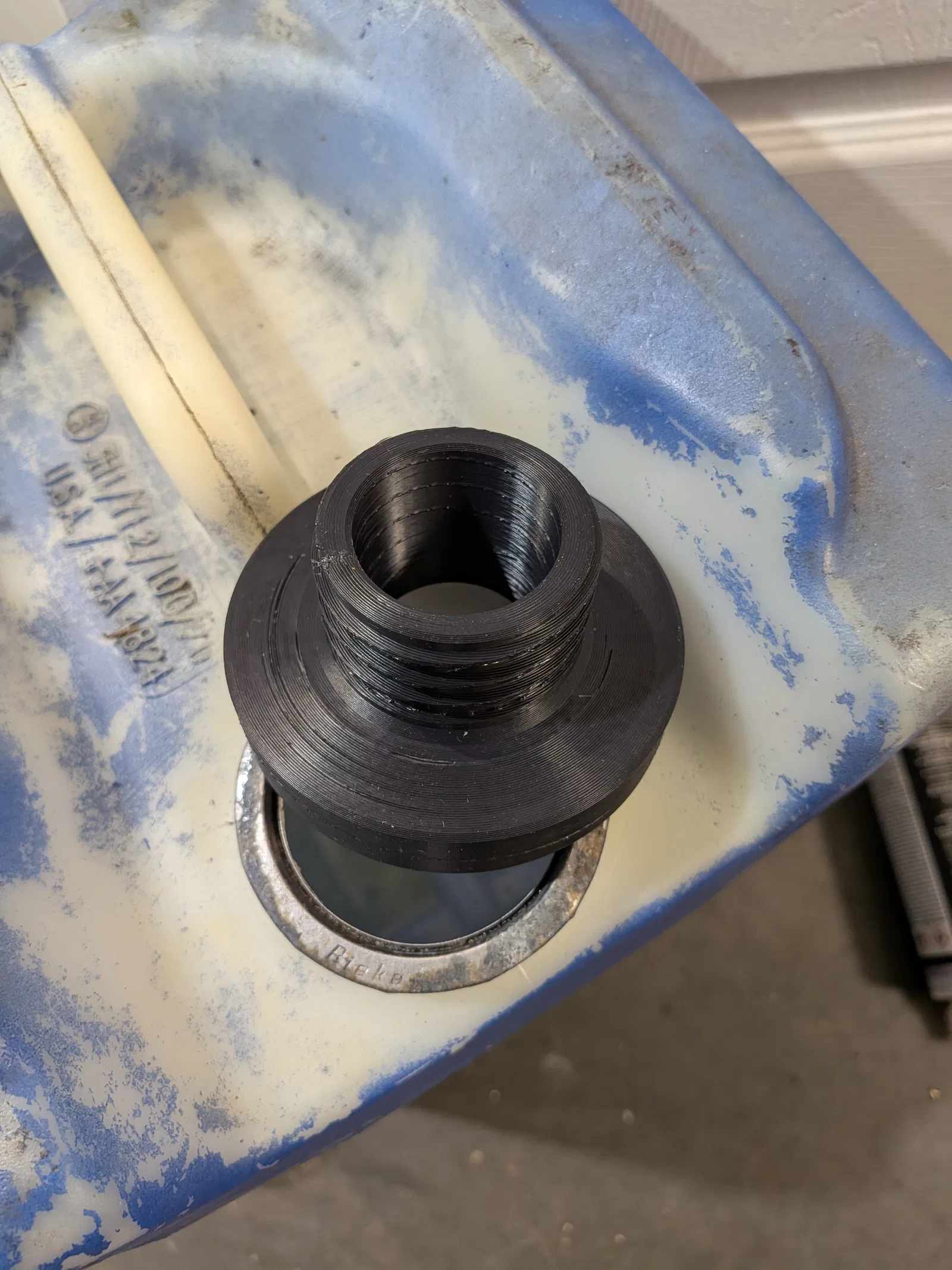 Cái này chuyển một cái thùng 5 gallon đựng bột giặt thông thường thành thùng xăng với nắp tương thích Midwest Can. Các loại thùng này có thể gọi là: 5.3 Gallon Tighthead | Carboy | Hedpack. Cái nắp Midwest Can có ren kiểu buttress khoảng M45 X 5mm.