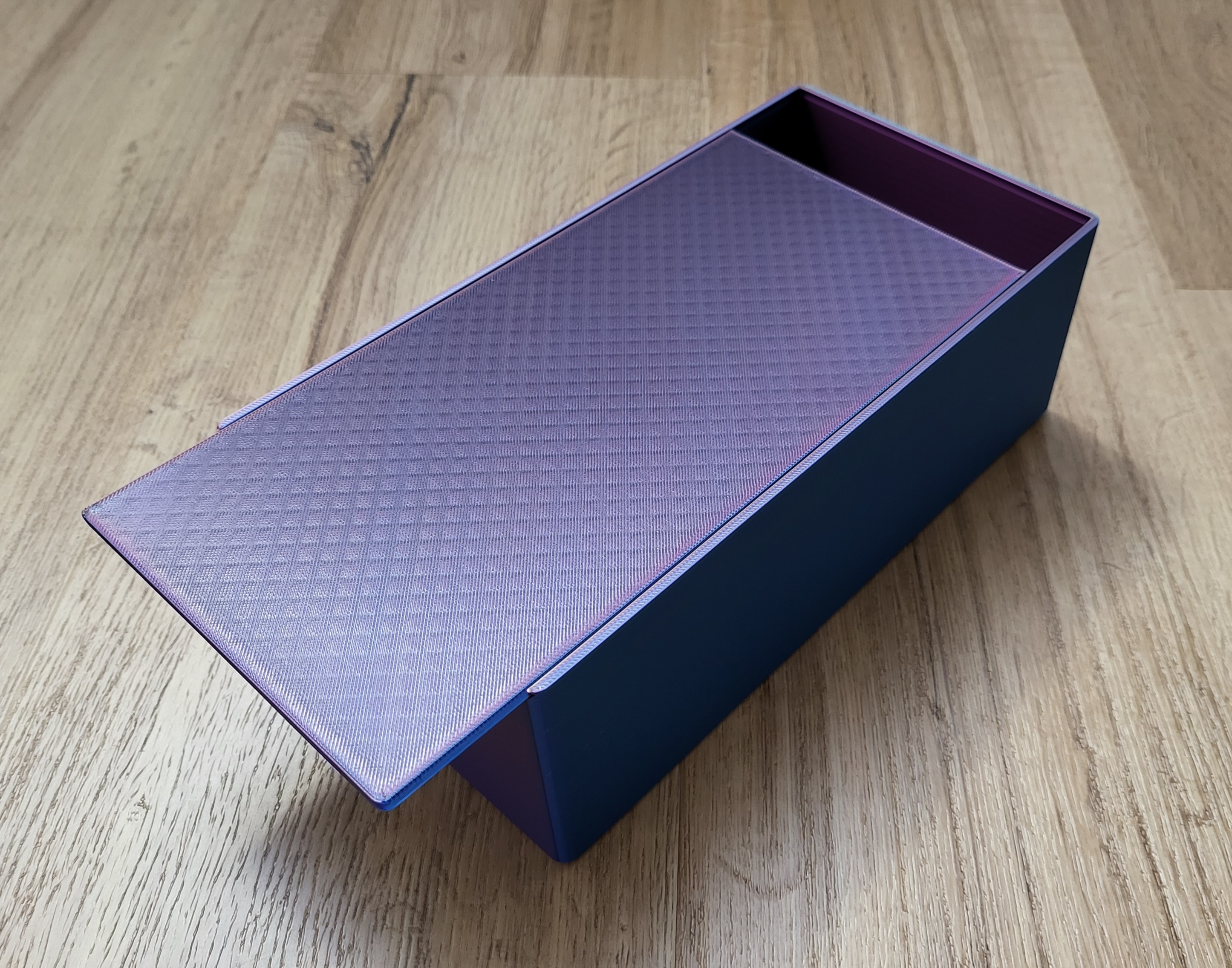 Điều này sẽ giúp ích cho những người khác muốn in nó cho riêng họ! Bản in trong hình được làm bằng Eryone Red Yellow Blue in trên tấm PEI có bề mặt nhám hai mặt. ### Lắp ráp Phiên bản đáy hở chỉ cần trượt lên hộp khăn giấy của bạn. Để đóng phiên bản có nắp trượt đáy, hãy trượt nắp vào vỏ bọc, với cạnh vát ở mặt nắp hướng về phía trước: