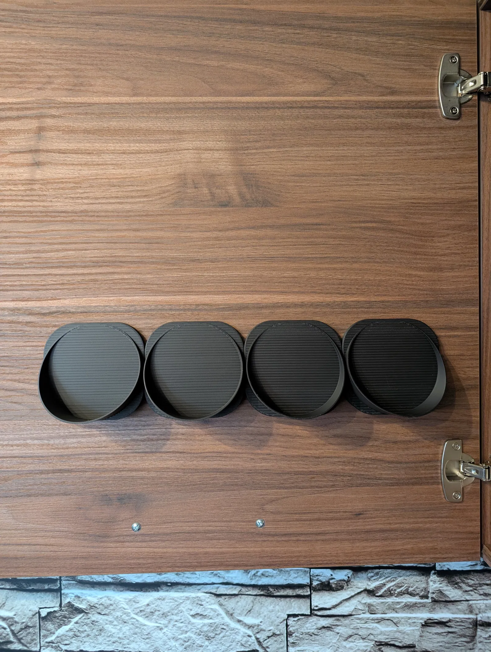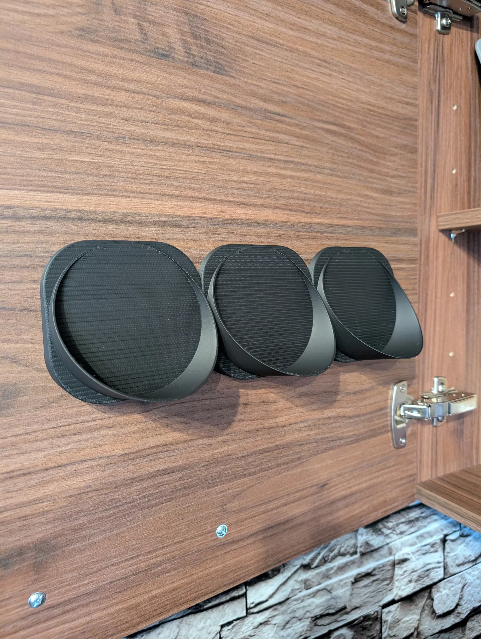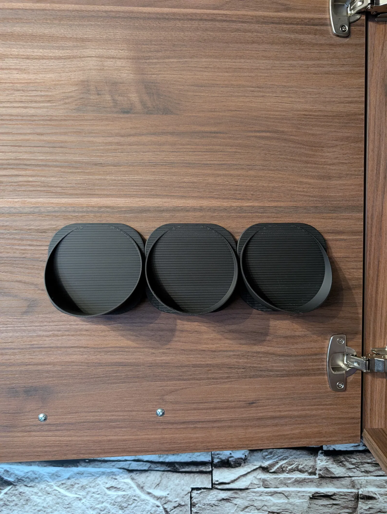Cái kẹp góc này được thiết kế cho các loại lon hoặc hộp có đường kính ngoài 94mm, giúp bạn cất giữ chúng gọn gàng và dễ lấy bên trong cánh cửa tủ. Giá đỡ chỉ cần gắn bằng băng keo hai mặt—không cần ốc vít, khoan hay dụng cụ nào khác.