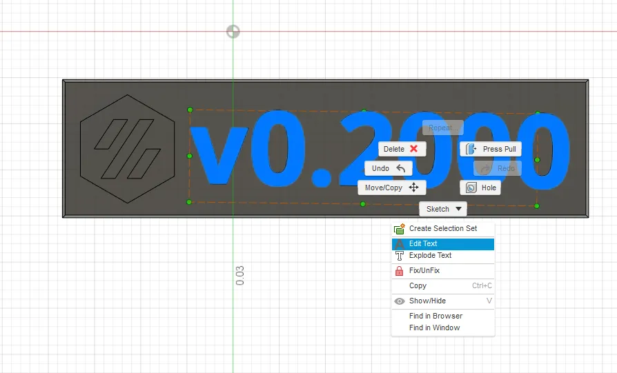 Sử dụng tệp Fusion 360 (bạn có thể nhận phiên bản miễn phí) và chỉnh sửa bản phác thảo/văn bản. Sau đó nhấp vào hoàn thành trên bản phác thảo để cập nhật mô hình của bạn mà bạn có thể xuất ra dưới dạng STL. Hoặc… đơn giản là thực hiện một bản phác thảo trên phần từ tệp Step và đặt phông chữ của bạn lên đó. Tôi đã chọn OpenSans.