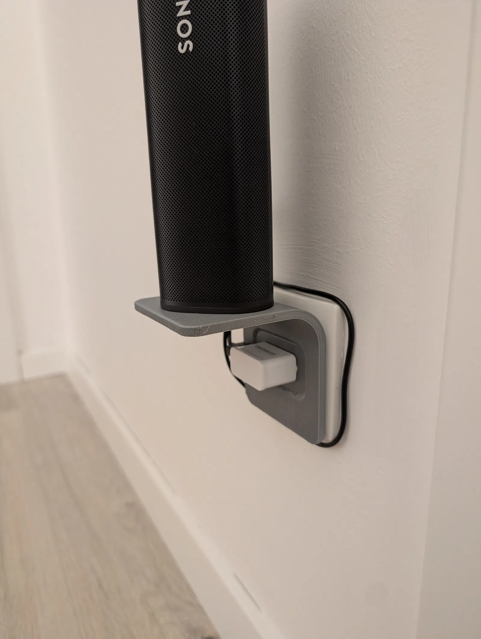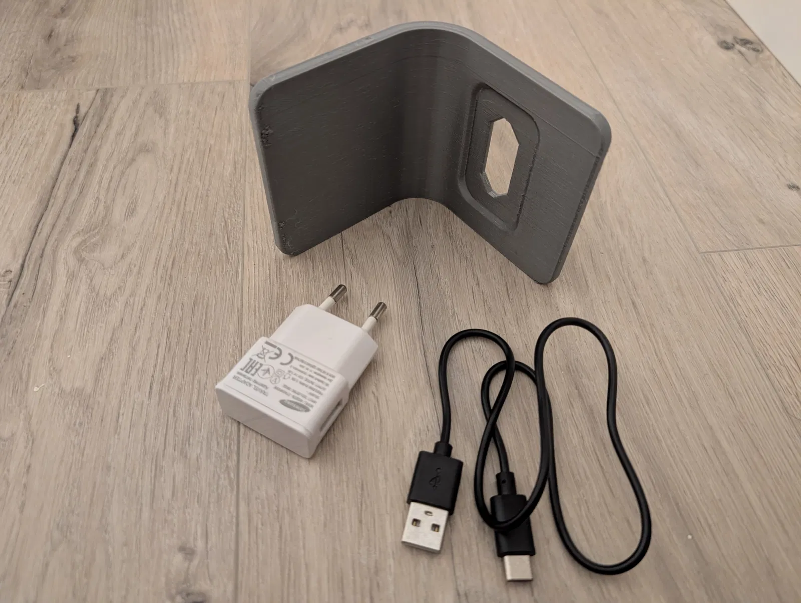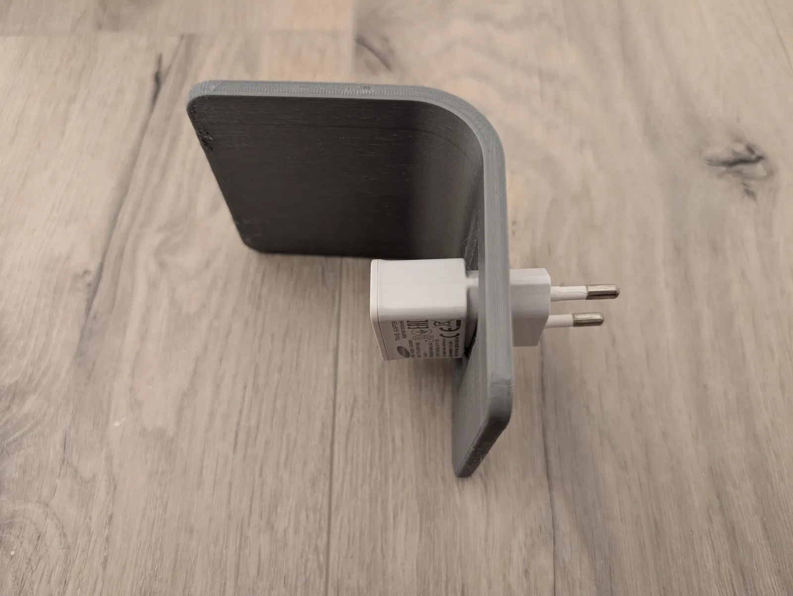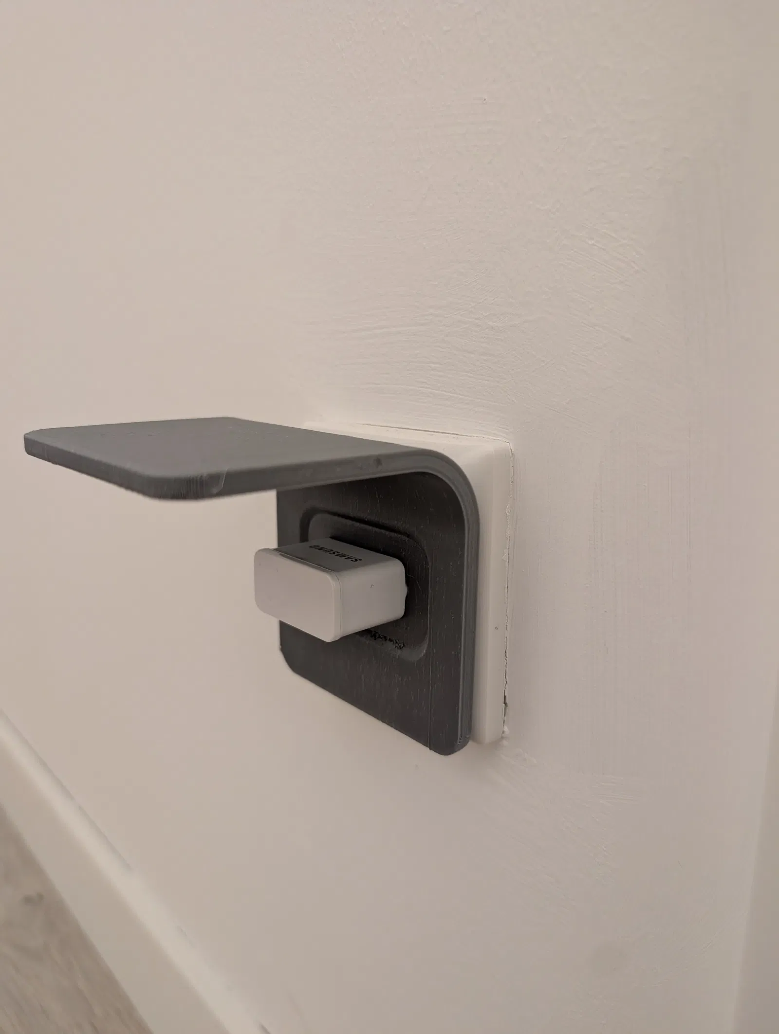 Kệ đơn giản gắn vào sạc USB để giữ các thiết bị nhỏ, ví dụ như hộp Bluetooth. Phiên bản 2 tinh chỉnh hơn, đựng được phích cắm lớn hơn, cạnh và cong đều nhau. In nằm nghiêng là tốt nhất.