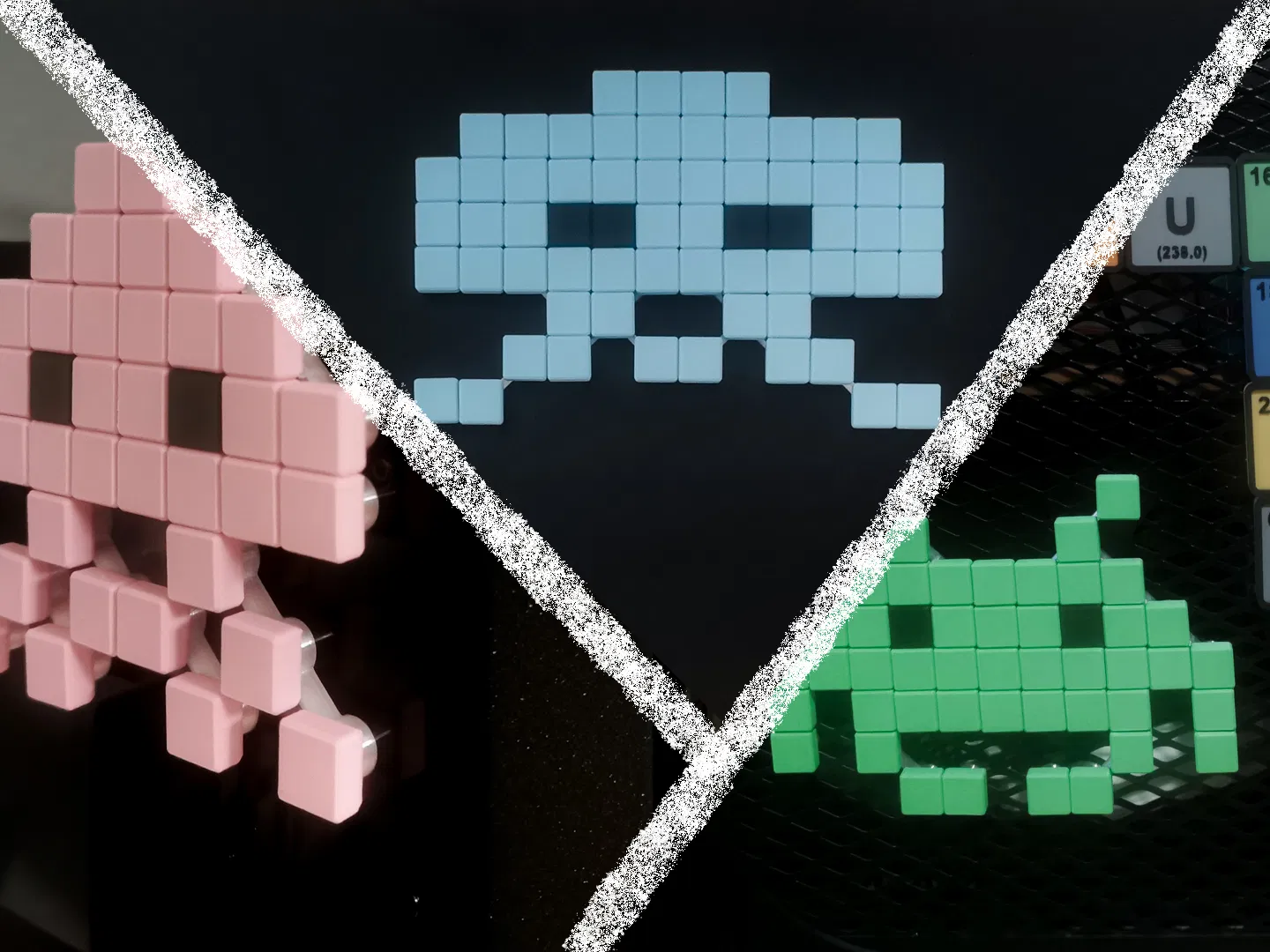 Sau khi phát hành của mình và vẫn còn cảm giác hoài cổ, tôi muốn tạo ra một thử thách pixel-art mới: ba sinh vật Space Invaders mang tính biểu tượng mà bạn có thể lắp ráp, tùy chỉnh và dán lên bất kỳ bề mặt kim loại nào.