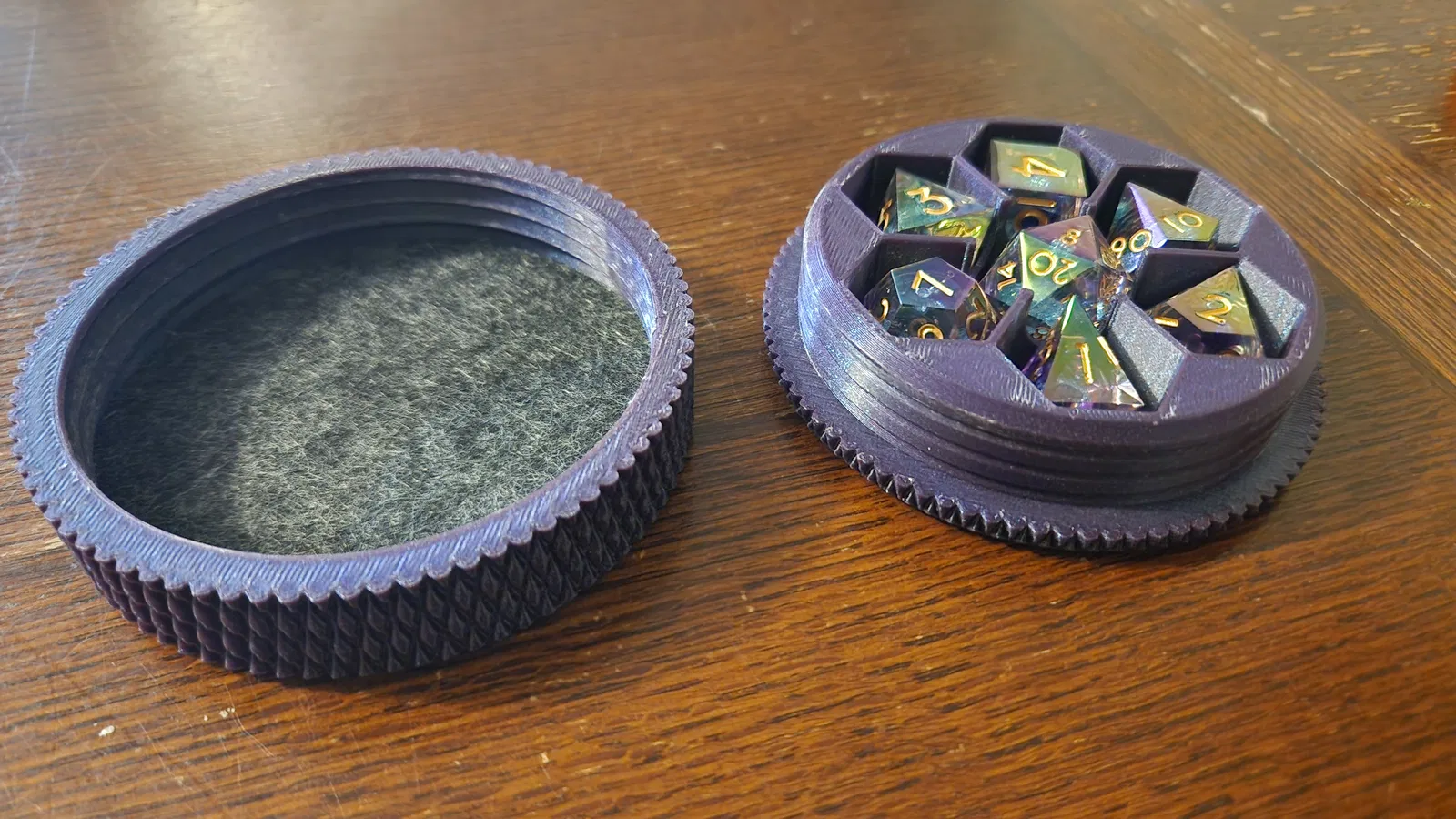 Hộp đựng xúc xắc nhỏ gọn, bỏ túi vừa vặn. Chứa được một bộ 7 viên xúc xắc tiêu chuẩn, vừa với viên xúc xắc lên tới 20mm. Tôi dùng nắp hộp làm đế/thảm để tung xúc xắc.