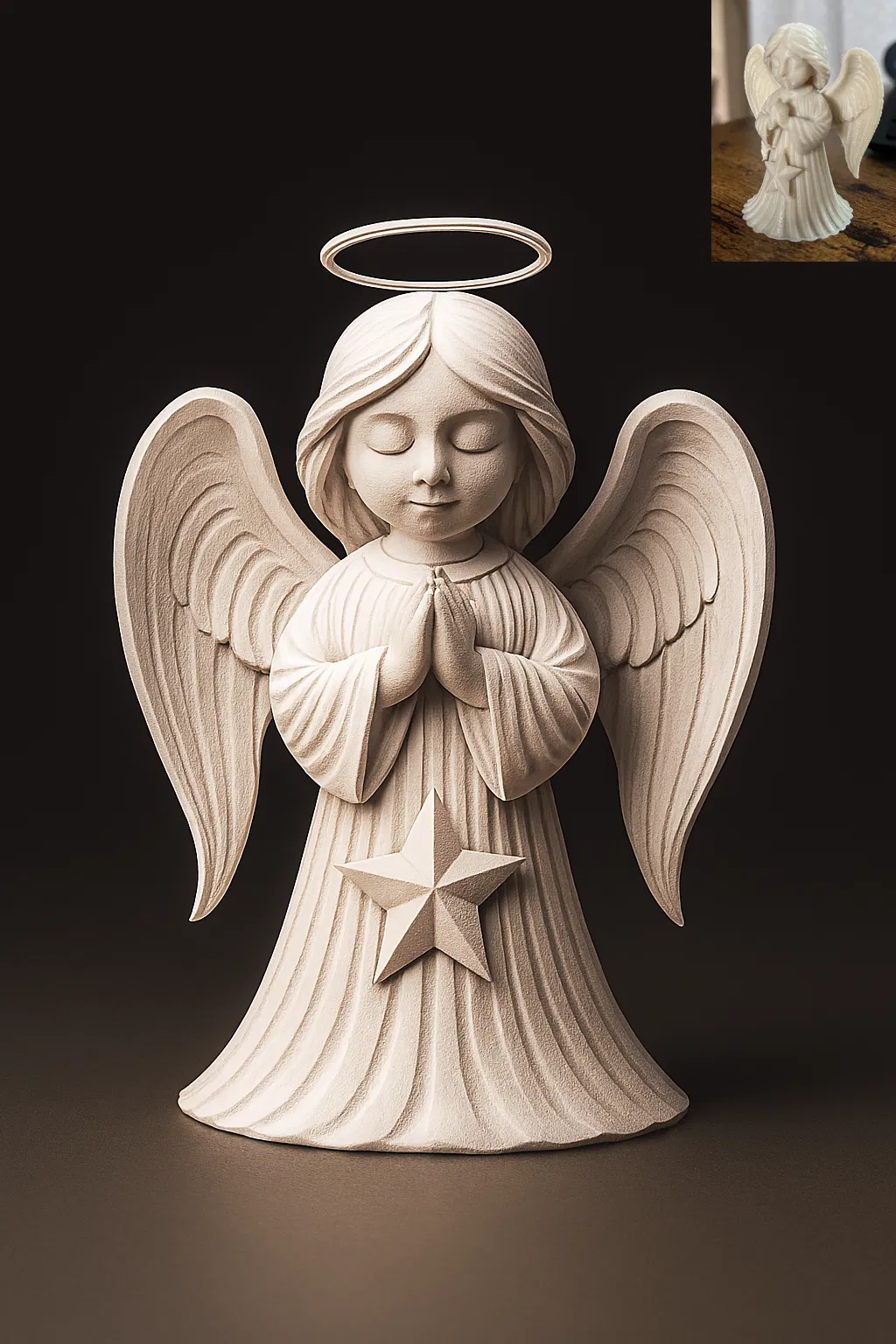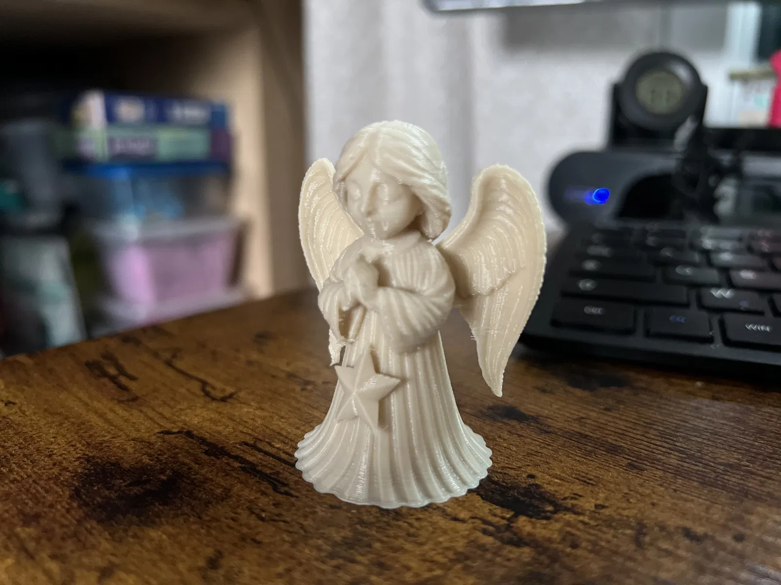 Một mô hình 3D Thiên thần Giáng sinh Dễ thương được tạo bằng AI. Người dùng chia sẻ kinh nghiệm in ấn trên máy cũ, nhấn mạnh khả năng in hoàn hảo của mô hình bất chấp các khuyết điểm nhỏ khi chụp cận cảnh.