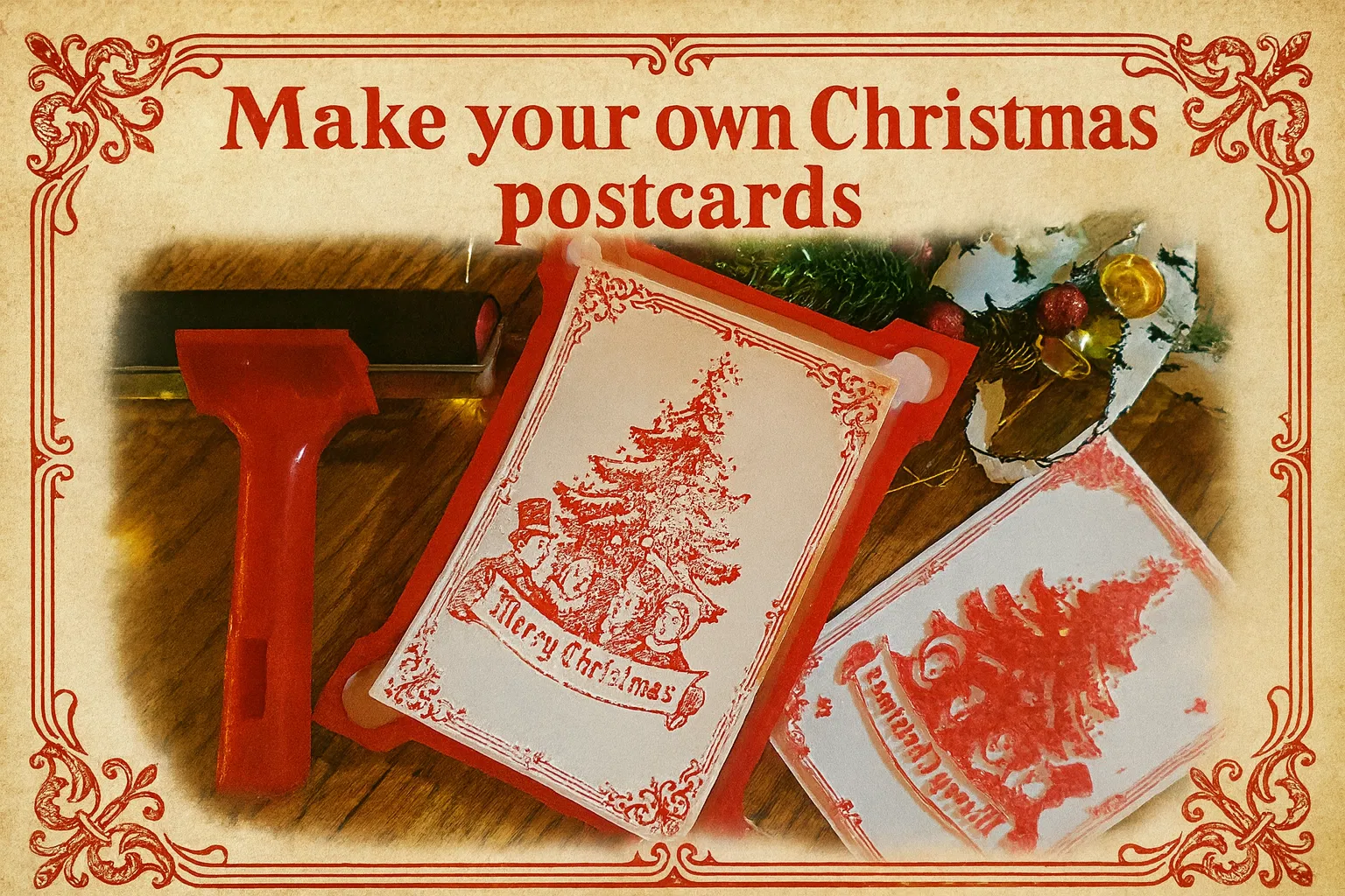 Biến những tấm bưu thiếp Giáng sinh mang phong cách vintage của riêng bạn với bộ khuôn in và phụ kiện dễ làm này. Hoàn hảo cho cả gia đình cùng thực hiện!
