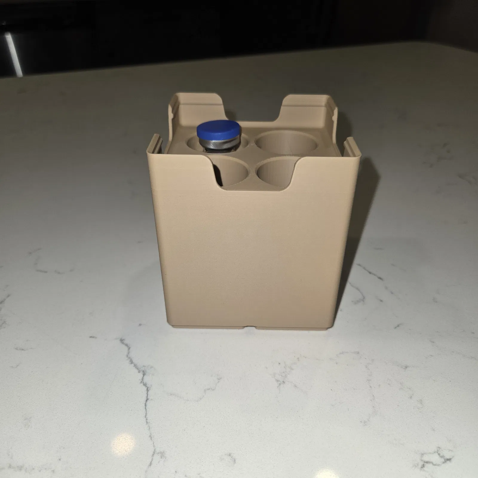 Giá đỡ lọ Gridfinity xếp chồng 2x2, chuyên dùng cho các lọ 30ml như Nước Vô Trùng. Sản phẩm này chứa được 4 lọ với đường kính tối đa 30.4mm và chiều cao 80mm, giúp bạn sắp xếp thuốc men gọn gàng.