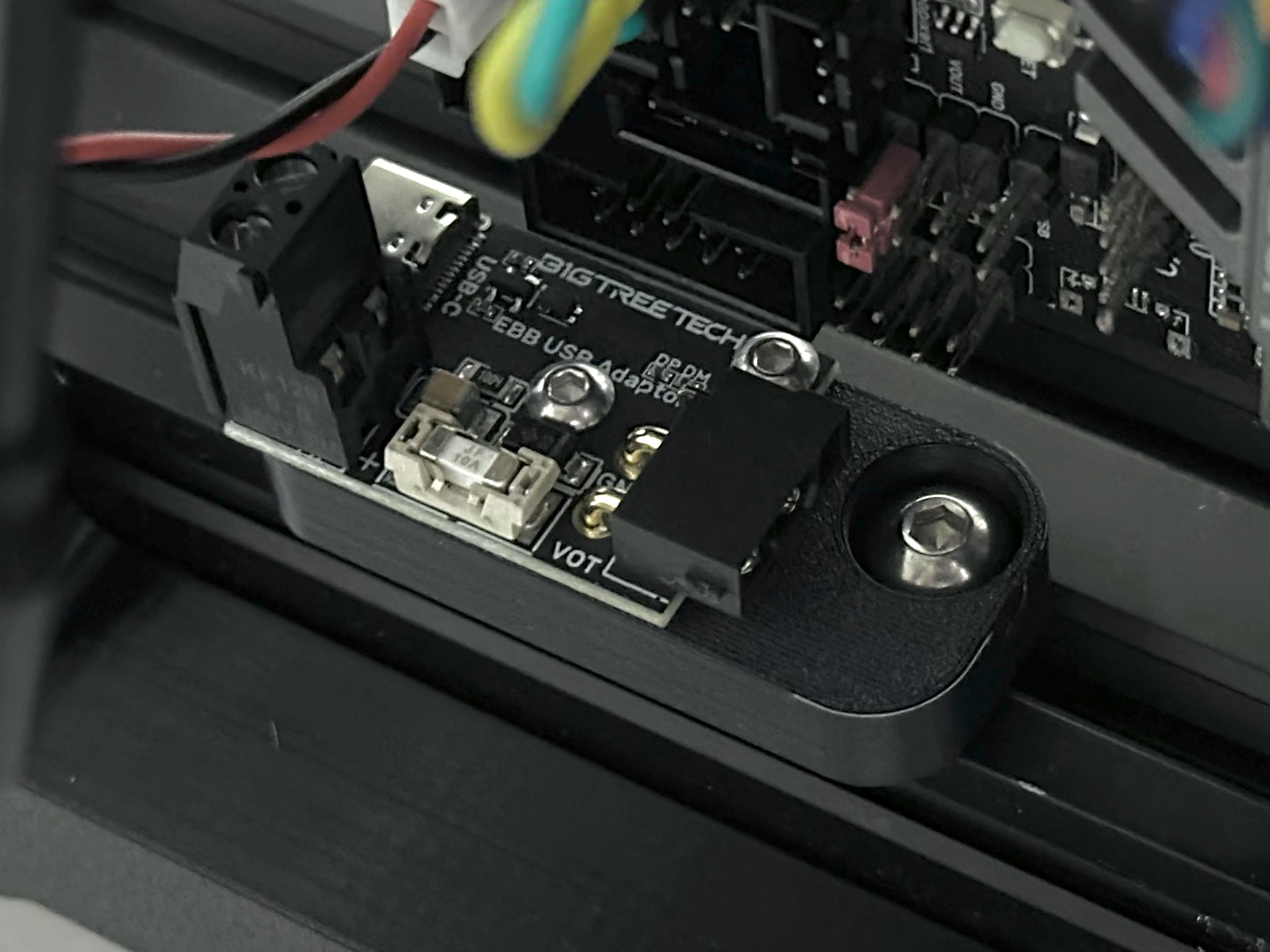 Gắn bo mạch BTT EBB USB của bạn lên nhôm định hình. Phiên bản này được thiết kế riêng, dễ dàng lắp đặt bằng ốc M5 và T-nut, có tùy chọn dùng ốc ren nhiệt M3 hoặc vặn trực tiếp.