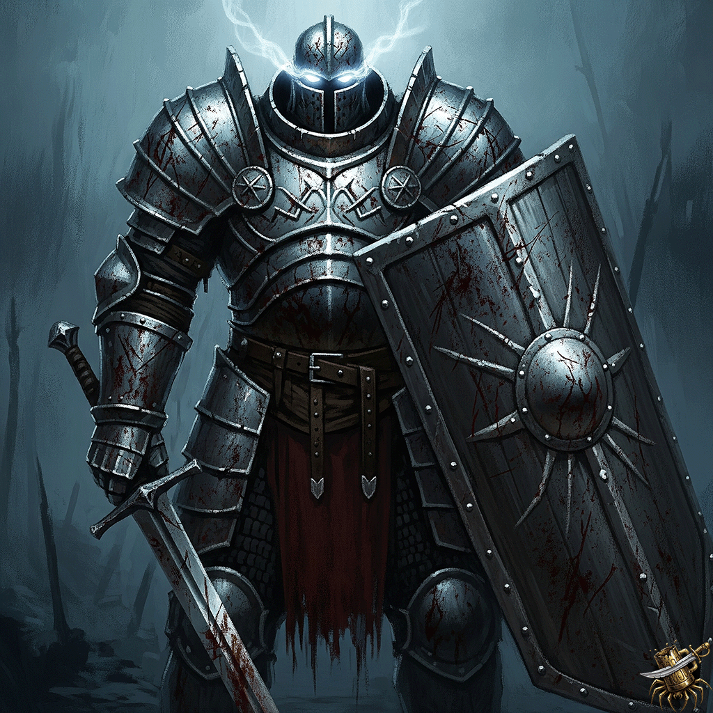Cái này là hiện thân của một bức tường khiên. Anh ta là một tảng đá thép vững chãi, không lay chuyển, được khảm bạc, sinh ra để chịu đựng mọi cơn bão. Đôi mắt anh ta chứa đựng sự chắc chắn lạnh lùng của bổn phận vĩnh cửu. Khi anh ta bước tới, bạn không chiến đấu với một hiệp sĩ; bạn đang chiến đấu với lòng trung thành không nao núng của những người lính đã mất của cả một vương quốc, hết người này đến người khác. Anh ta đứng đó, chịu đựng sự hỗn loạn với sự thờ ơ kiên nhẫn. Hãy nhìn anh ta kỹ: một phút, anh ta là một bức tường khiên bất khả xâm phạm với hình dạng không thể phá vỡ; phút tiếp theo, anh ta là một kẻ báo thù với đòn tấn công mạnh mẽ. Bạn không đánh bại anh ta bằng cách đánh mạnh hơn; bạn đánh bại anh ta bằng cách tìm ra bóng ma nào đang điều khiển cơ thể.