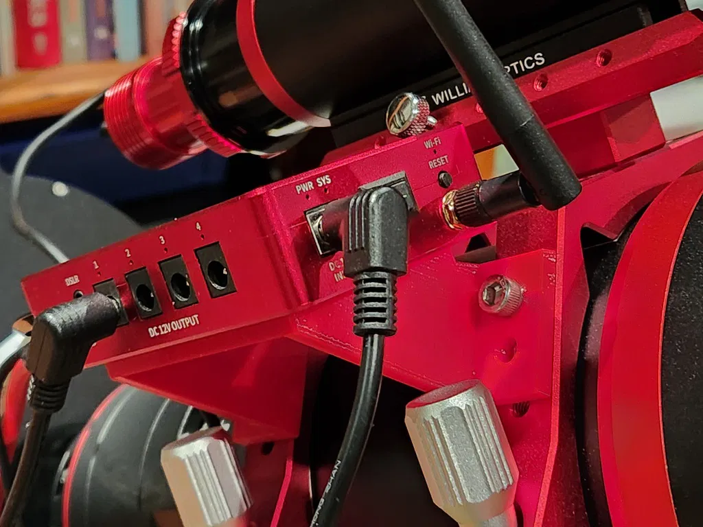 Cái đế này gắn bộ điều khiển ASIAIR Plus lên kính thiên văn William Optics Ultra-Cat 108. Bộ điều khiển được gắn theo chiều ngang so với kính thiên văn.