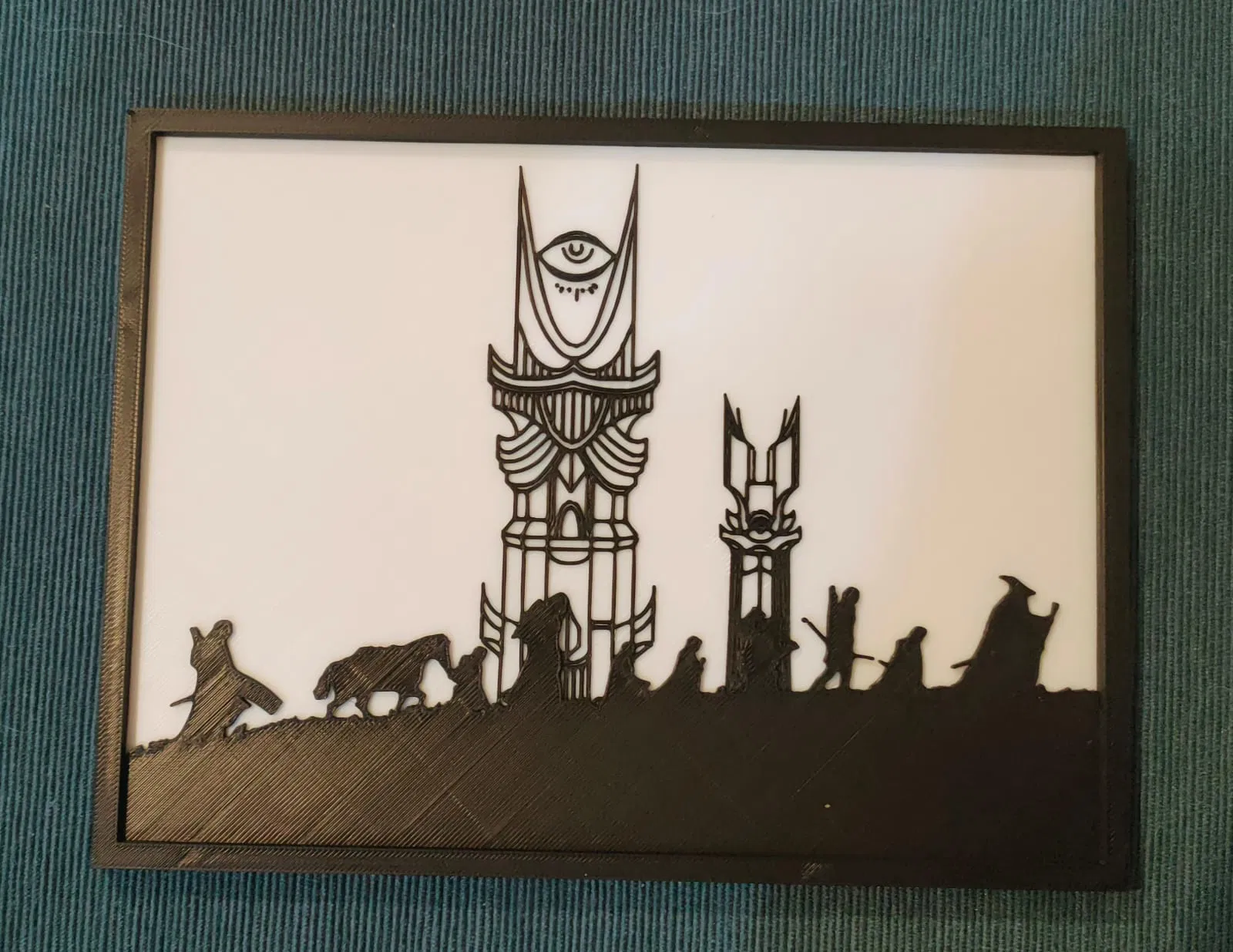 Khung tranh tường chủ đề Chúa Nhẫn với cảnh silhouette các tòa tháp và nhân vật, thích hợp cho in 3D hai màu, kích thước 15x20cm. Tối ưu cho in PLA, không cần hỗ trợ.