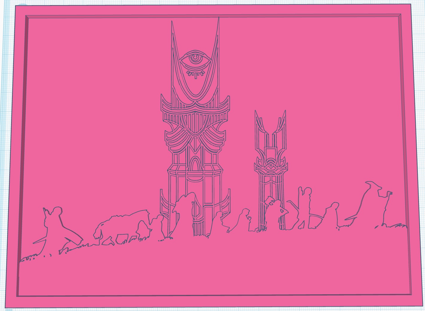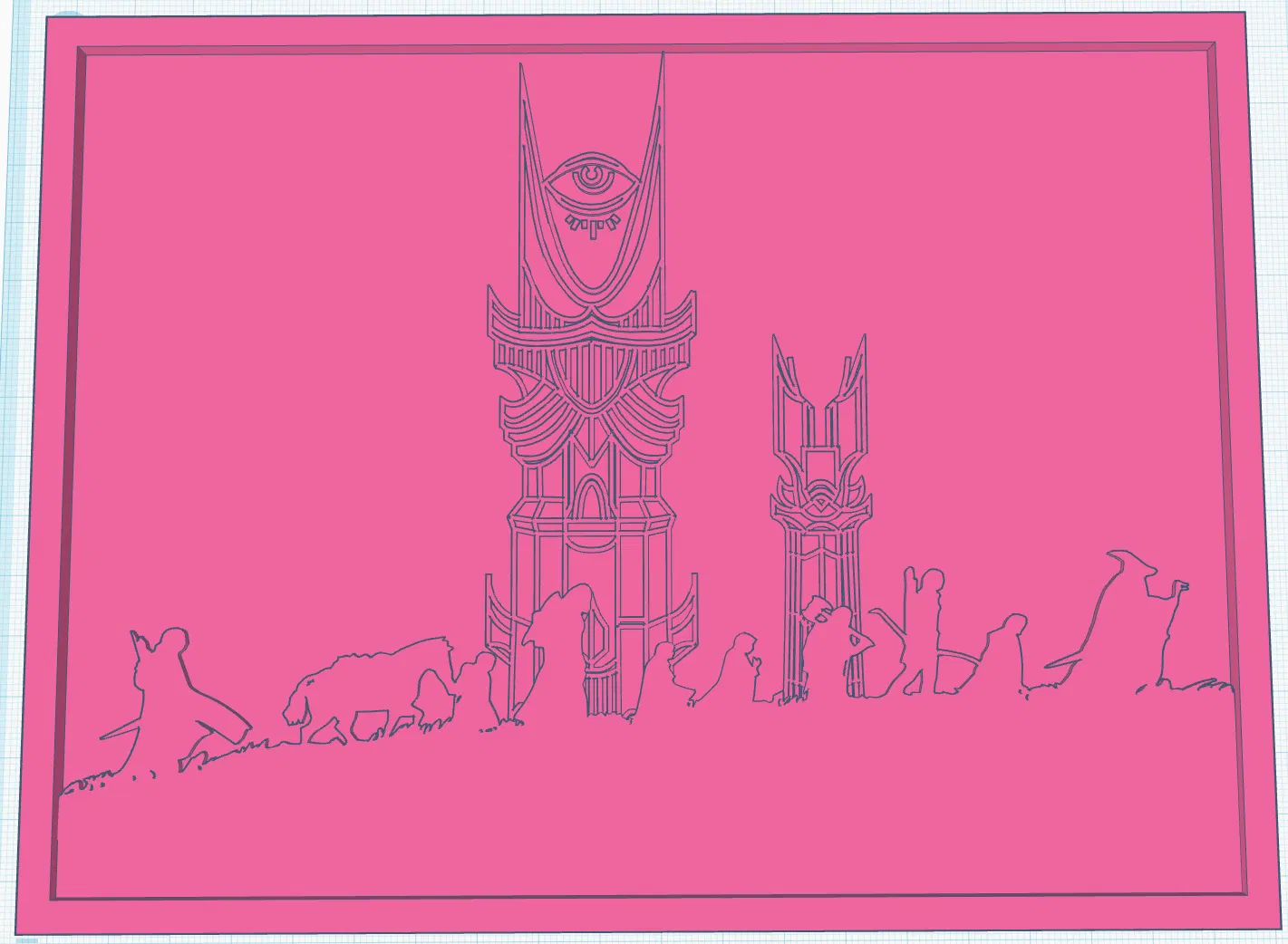Mô hình này là một cảnh silhouette chủ đề Chúa Nhẫn, với các tòa tháp biểu tượng và một hàng nhân vật băng qua tiền cảnh, được thiết kế như một miếng chèn in 3D cho khung ảnh tiêu chuẩn 20x15 cm. Tệp bao gồm một tấm nền phẳng và một hình bóng nổi lên màu đen tạo độ tương phản mạnh mẽ khi in bằng sợi màu sáng và tối.