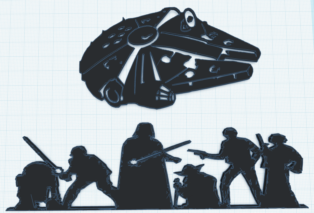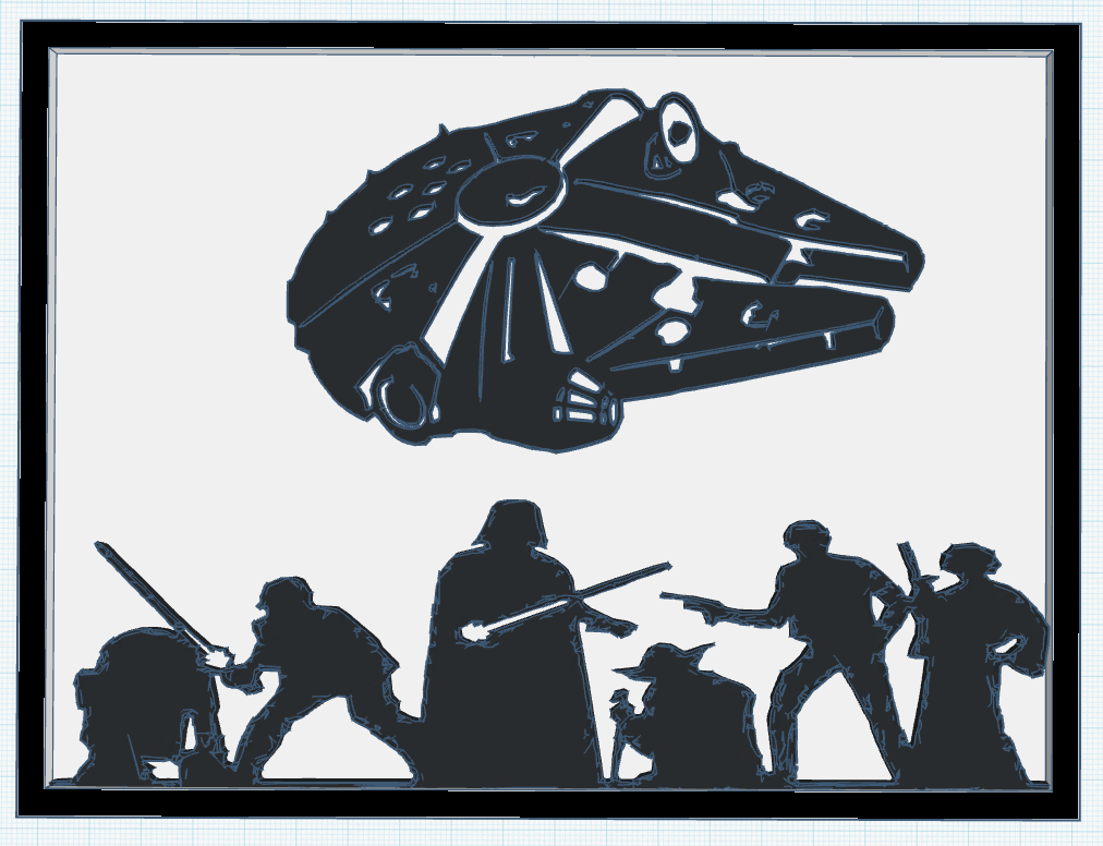Tấm bảng treo tường lấy cảm hứng từ Star Wars, có hình Thuyền Thiên niên kỷ (Millennium Falcon) nổi khối nhẹ phía trên hàng loạt hình bóng nhân vật mang tính biểu tượng trong tư thế chiến đấu đầy năng lượng. Mô hình được thiết kế dạng mặt phẳng, dễ dàng in mà không cần vật liệu hỗ trợ, rất phù hợp làm vật trang trí tường nhỏ hoặc trưng bày trên bàn cho các fan phim ảnh.