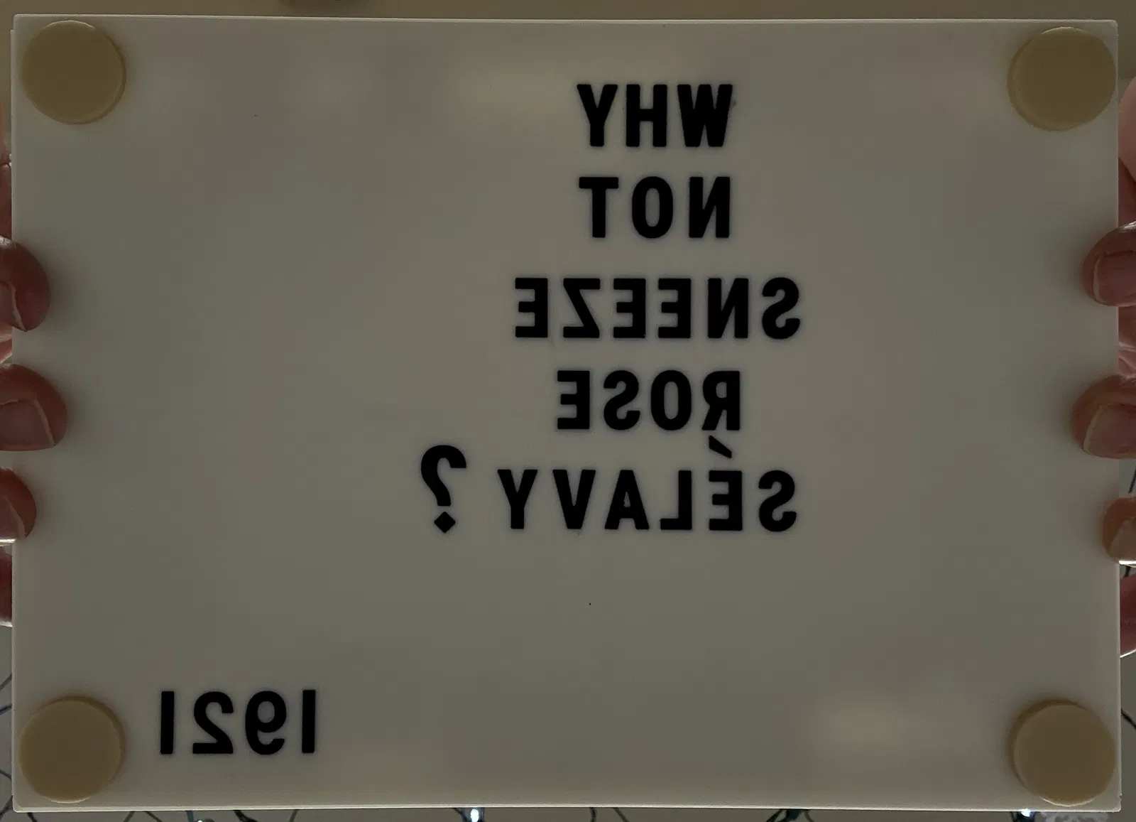 Một trong những điểm của bộ sưu tập này là cho phép mọi người tương tác với các tác phẩm theo cách mà Duchamp mong muốn — đó là, KHÔNG phải như chúng ta thấy chúng trong bảo tàng! Đối với tác phẩm này, hãy đặt mô hình đã hoàn thành trên bàn hoặc bệ để tác phẩm mời gọi người xem nhấc nó lên. Một phương án khác được thấy trong hình ảnh: đặt tác phẩm sao cho một chiếc gương phản chiếu văn bản bên dưới. Điều này có thể được thực hiện bằng cách treo tác phẩm hoặc đặt nó trên kệ kính với gương bên dưới kệ.