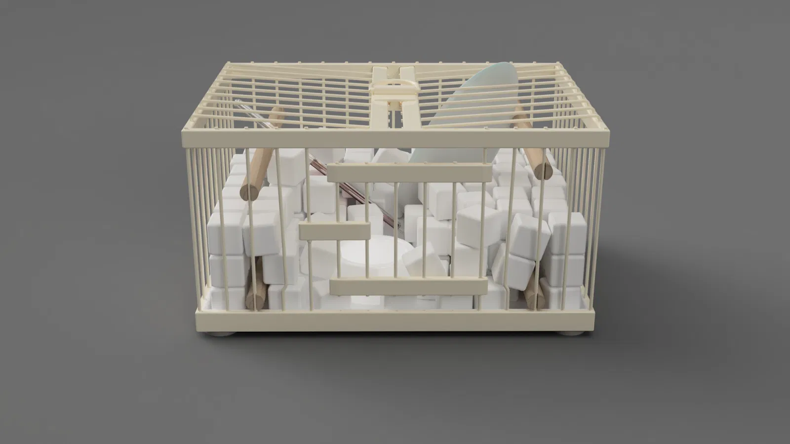 Nó bao gồm một lồng chim, 152 khối đá cẩm thạch trắng, một nhiệt kế, một xương mai và một đĩa sứ nhỏ. Lồng chim được làm bằng kim loại sơn và có que đậu bằng gỗ. Có một dòng chữ ở dưới cùng với tiêu đề và ngày của tác phẩm.